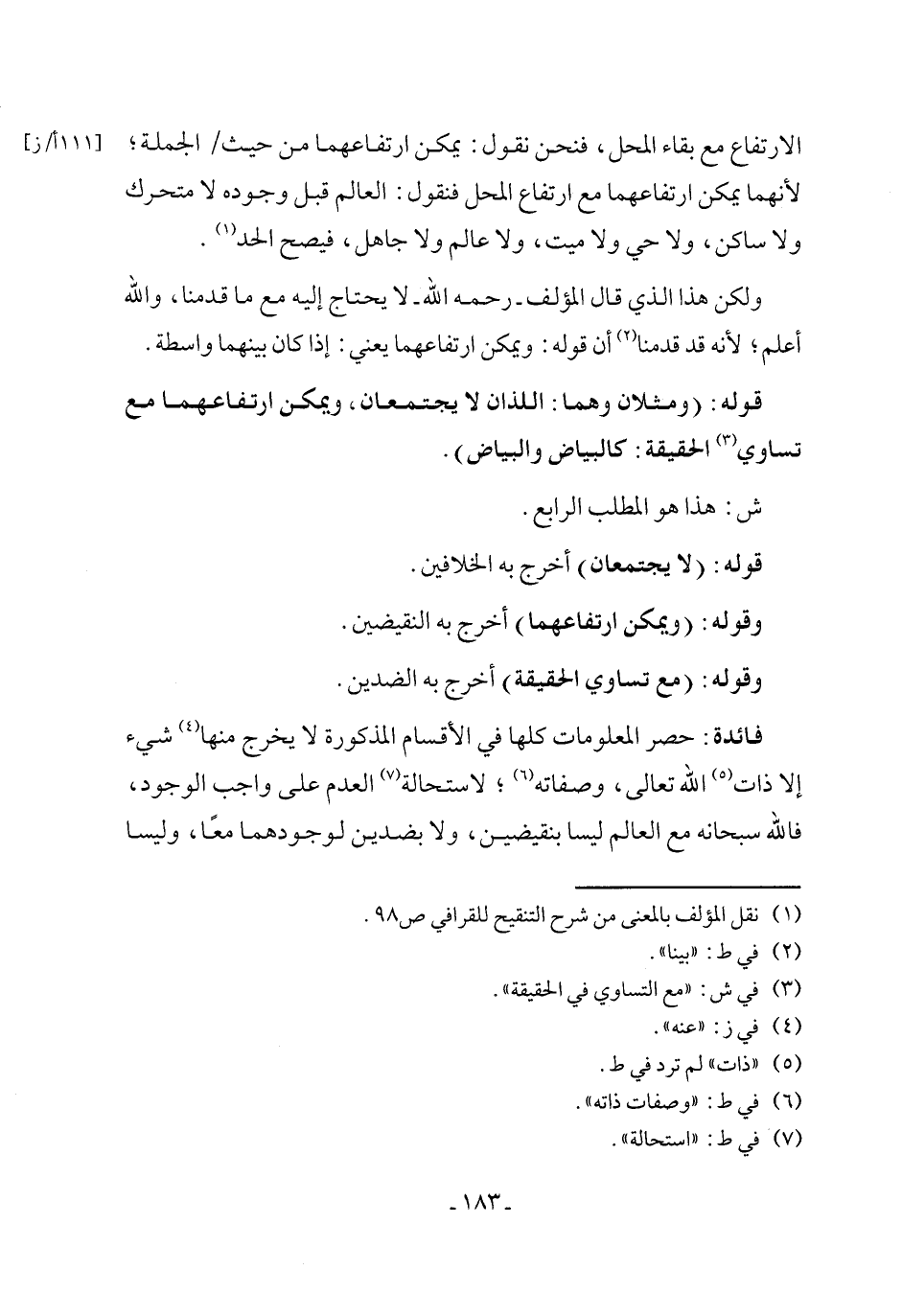 فائدة: حصر المعلومات كلها في الأقسام المذكورة لا يخرج منها (٤) شيء إلا ذات (٥) الله تعالى، وصفاته (٦)؛ لاستحالة (٧) العلم على واجب الوجود، فالله سبحانه مع العالم ليسا بنقيضين، ولا بضدين لوجودهما معًا، وليسا