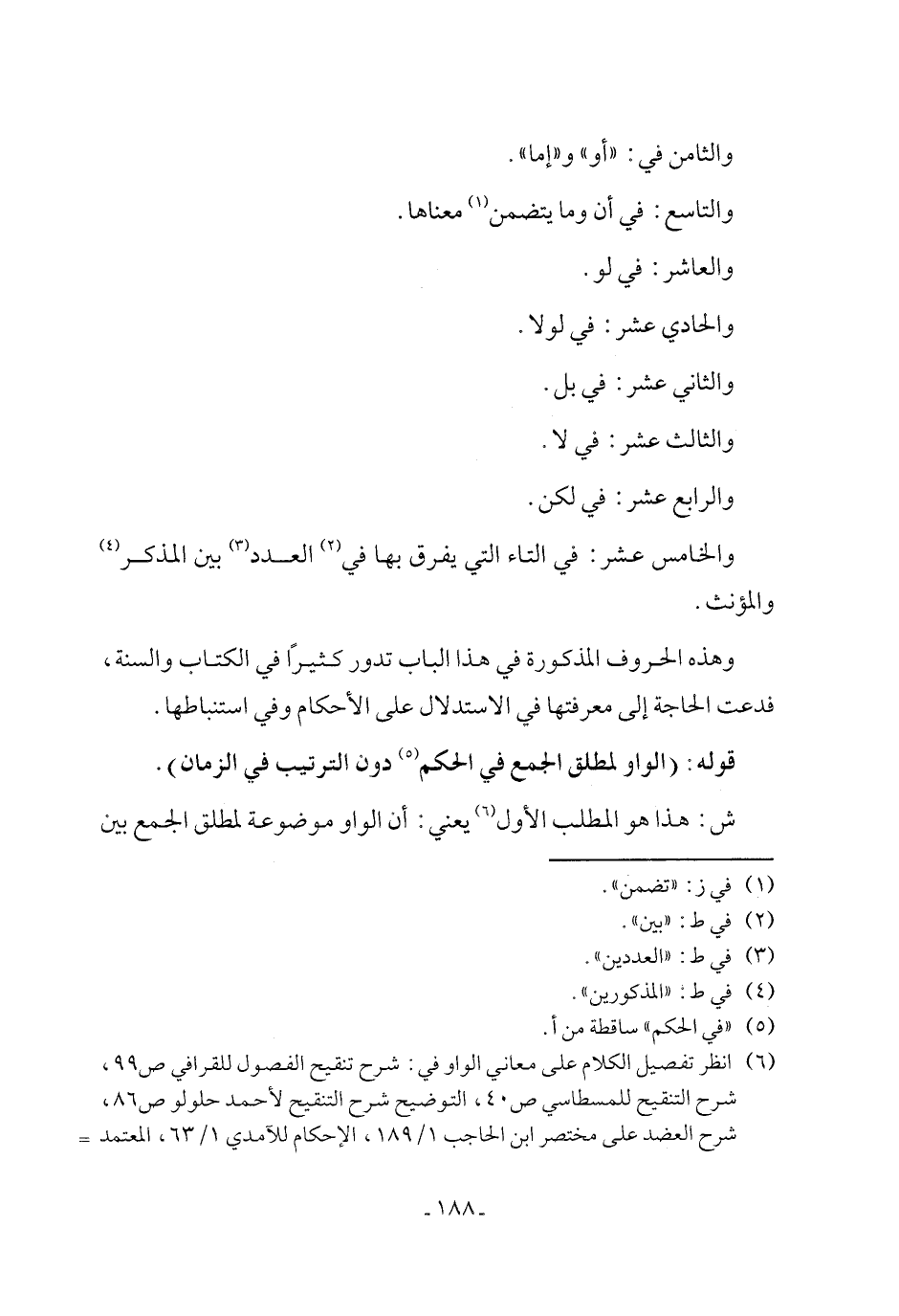 (٦) انظر تفصيل الكلام على معاني الواو في: شرح تنقيح الفصول للقرافي ص ٩٩، شرح التنقيح للمسطاسي ص ٤٠، التوضيح شرح التنقيح لأحمد حلولو ص ٨٦، شرح العضد على مختصر ابن الحاجب ١/ ١٨٩، الإحكام للآمدي ١/ ٦٣، المعتمد =