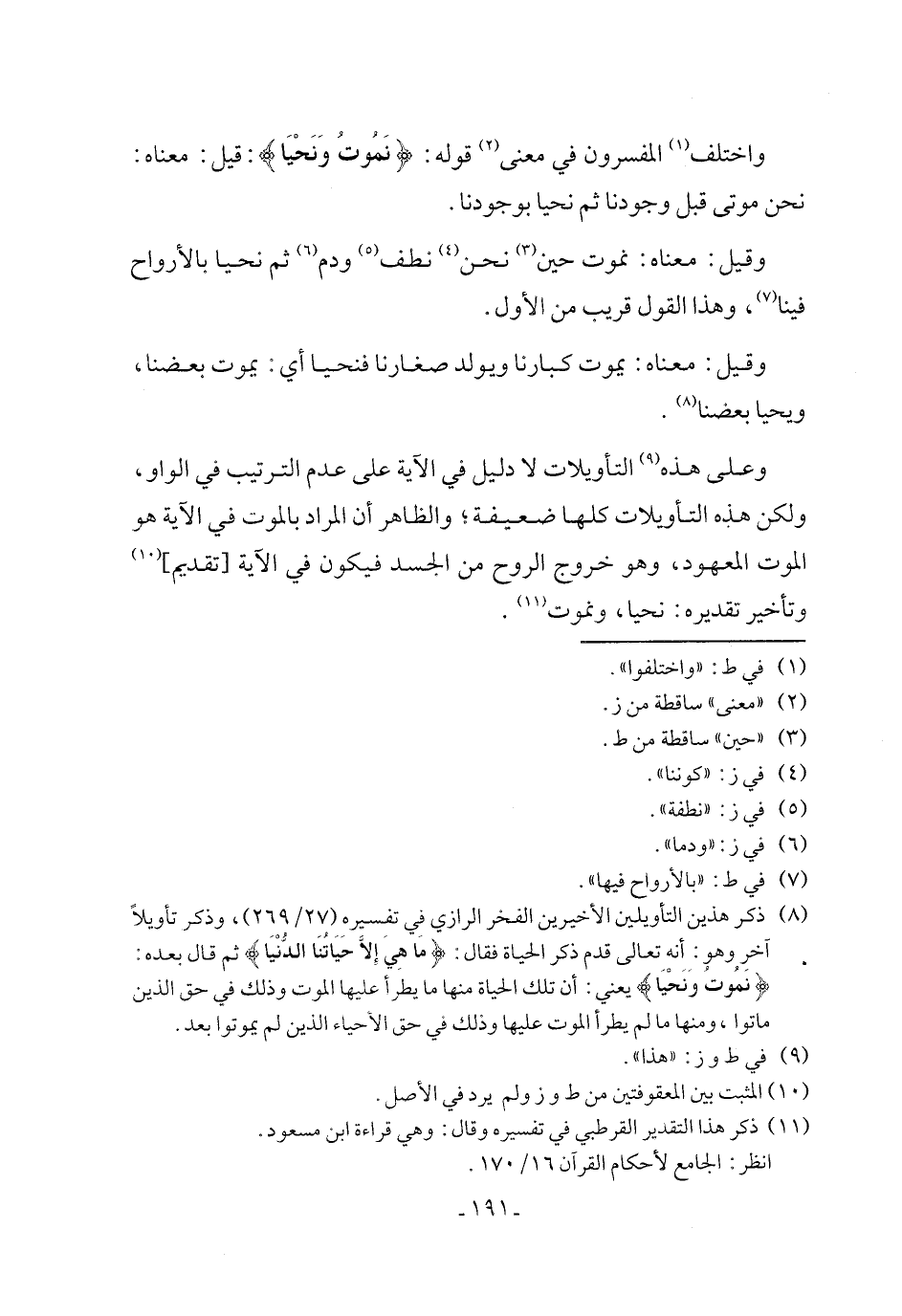 (٨) ذكر هذين التأويلين الأخيرين الفخر الرازي في تفسيره (٢٧/ ٢٦٩)، وذكر تأويلاً آخرِ وهو: أنه تعالى قدم ذكر الحياة فقال: {مَا هِيَ إلا حَيَاتُنَا الدُّنْيَا} ثم قال بعده: {نَمُوتُ وَنَحْيَا} يعني: أن تلك الحياة منها ما يطرأ عليها الموت وذلك في حق الذين ماتوا، ومنها ما لم يطرأ الوت عليها وذلك في حق الأحياء الذين لم يموتوا بعد.