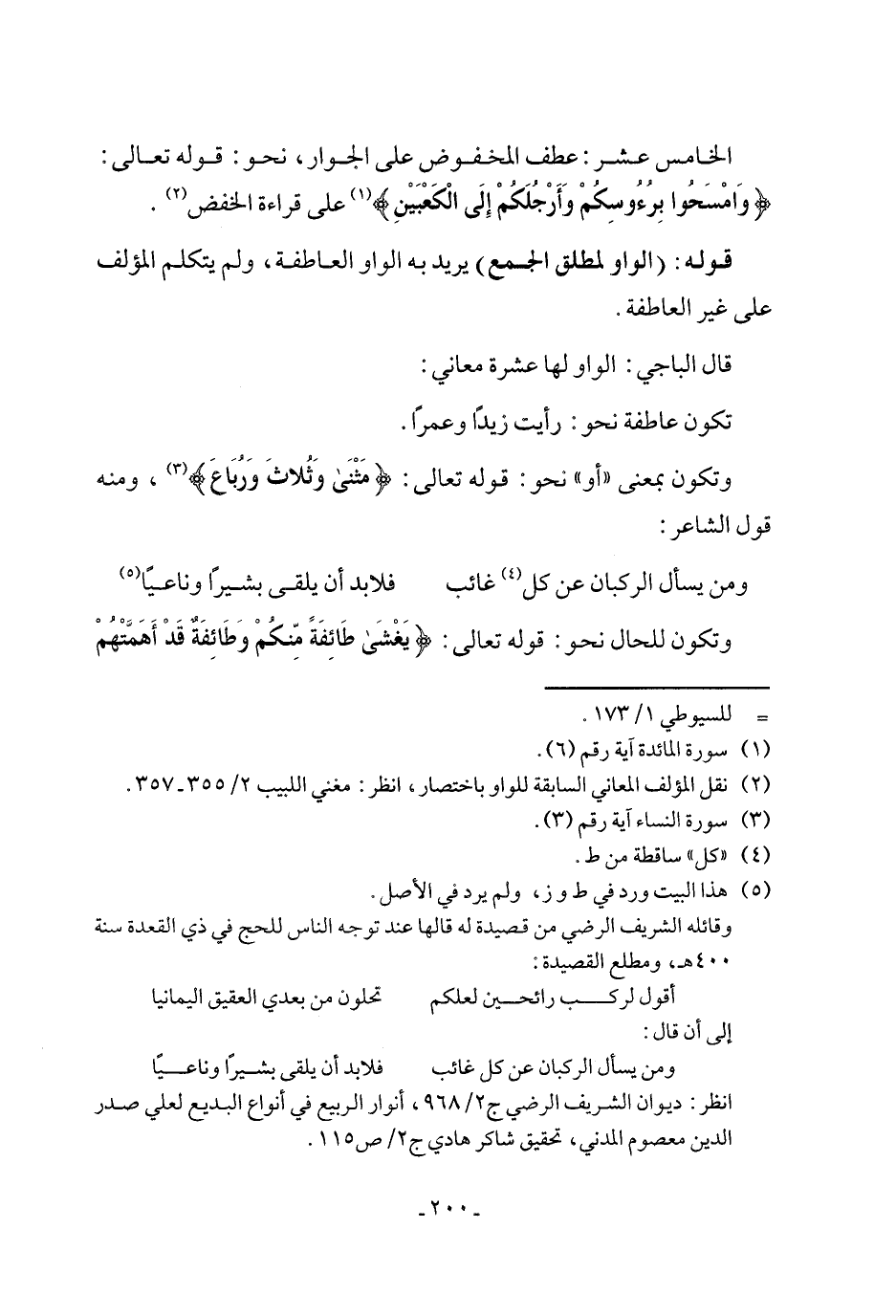 الخامس عشر: عطف المخفوض على الجوار، نحو: قوله تعالى: {وَامْسَحُوا بِرُءُوسِكُمْ وَأَرْجُلَكُمْ إِلَى الْكَعْبَيْن} (١) على قراءة الخفض (٢).