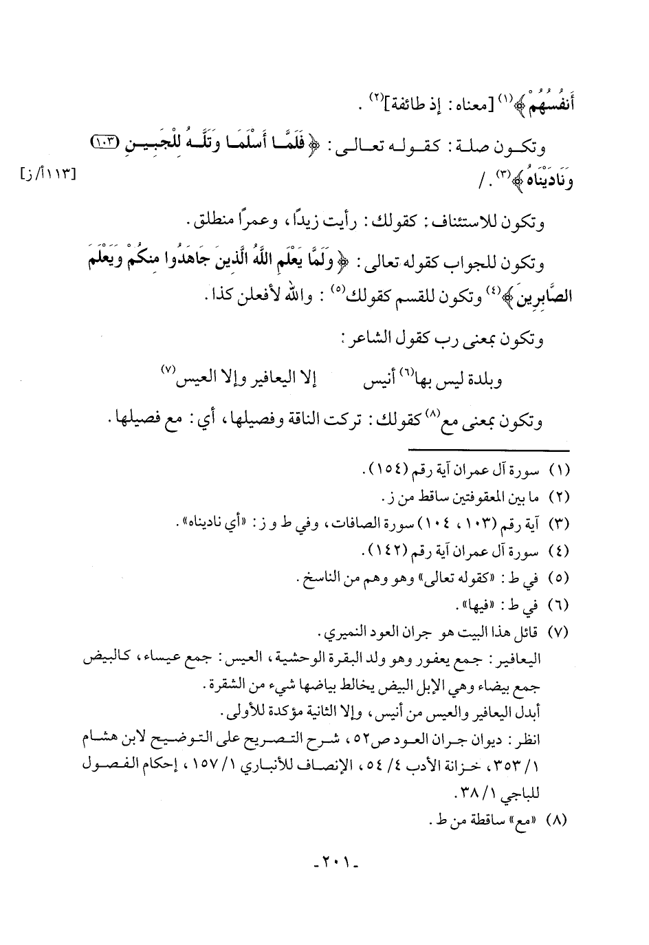 وتكون بمعنى مع (٨) كقولك: تركت الناقة وفصيلها، أي: مع فصيلها.