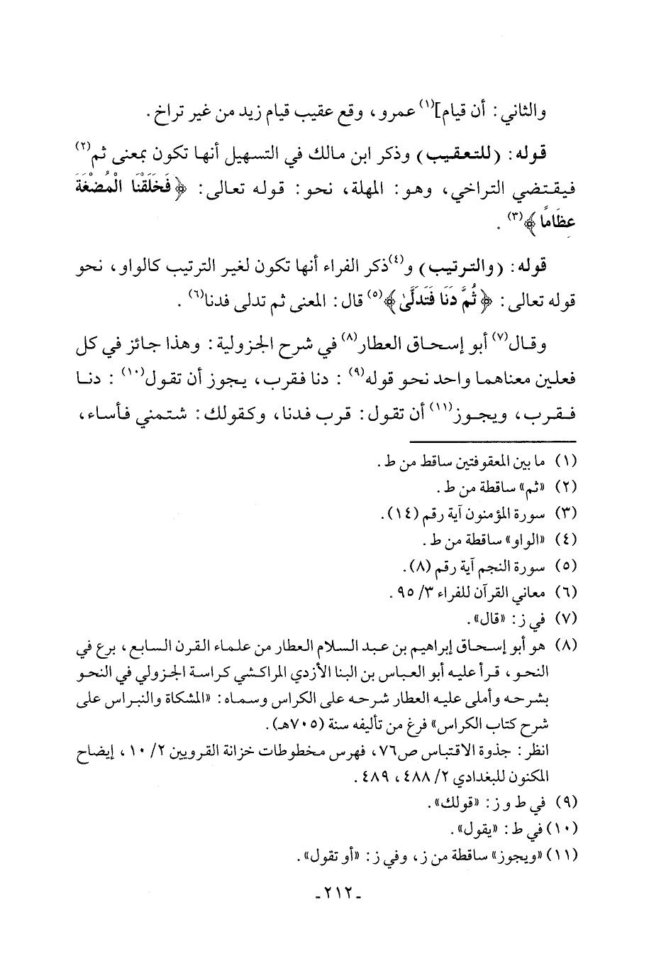قوله: (والترتيب) و (٤) ذكر الفراء أنها تكون لغير الترتيب كالواو، نحو قوله تعالى: {ثُمَّ دَنَا فَتَدَلَّى} (٥) قال: المعنى ثم تدلى فدنا (٦).