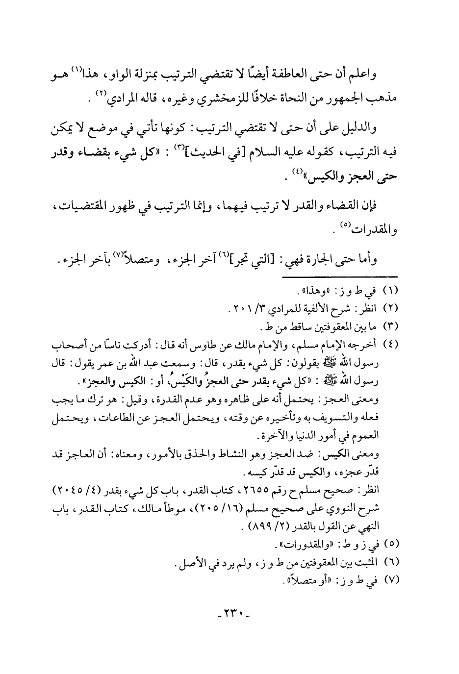 (٤) أخرجه الإمام مسلم، والإمام مالك عن طاوس أنه قال: أدركت ناسًا من أصحاب رسول الله - صلى الله عليه وسلم - يقولون: كل شيء بقدر، قال: وسمعت عبد الله بن عمر يقول: قال رسول الله - صلى الله عليه وسلم -: "كل شيء بقدر حتى العجز والكَيْسُ، أو: الكيس والعجز".