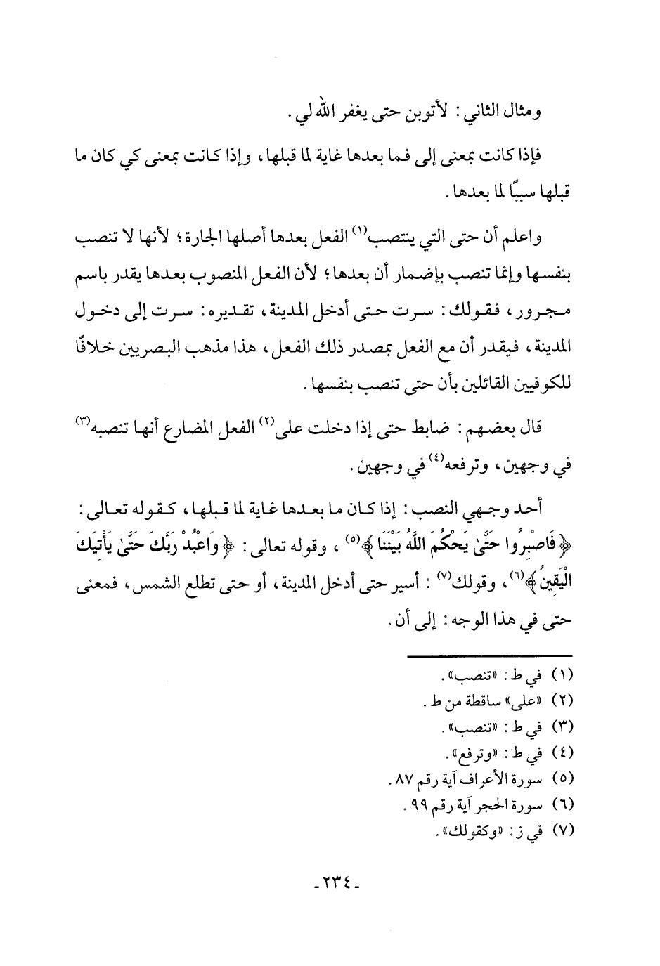 أحد وجهي النصب: إذا كان ما بعدها غاية لما قبلها، كقوله تعالى: {فَاصْبِرُوا حَتَّى يَحْكُمَ اللَّهُ بَيْنَنَا} (٥)، وقوله تعالى {وَاعْبُدْ رَبَّكَ حَتَّى يَأْتِيَكَ الْيَقِينُ} (٦)، وقولك (٧): أسير حتى أدخل المدينة، أو حتى تطلع الشمس، فمعنى حتى في هذا الوجه: إلى أن