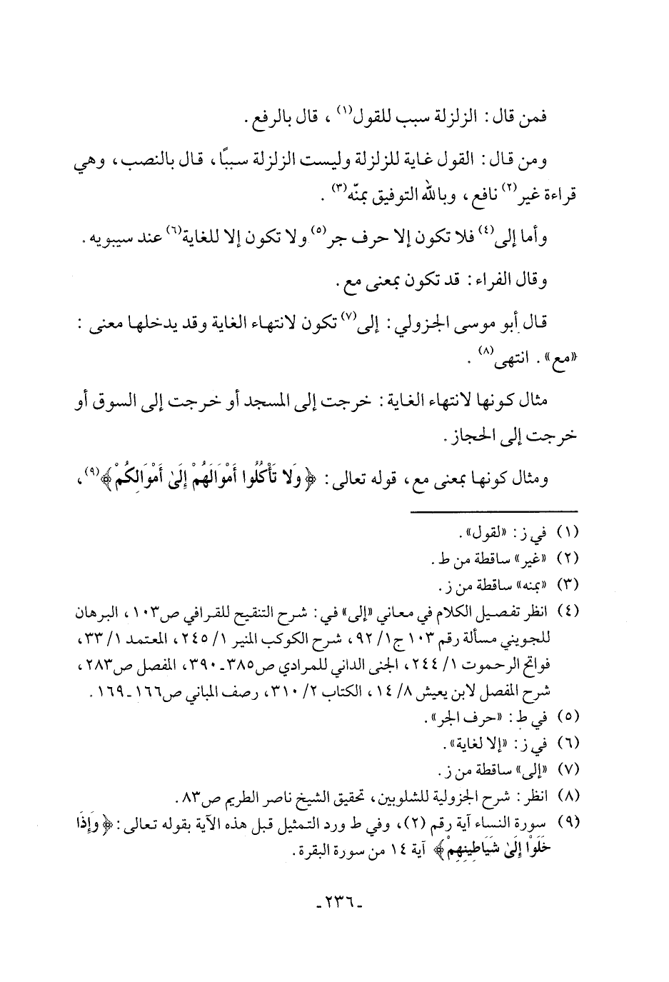 (٤) انظر تفصيل الكلام في معاني "إلى" في: شرح التنقيح للقوافي ص ١٠٣، البرهان للجويني مسألة رقم ١٠٣ ج ١/ ٩٢، شرح الكوكب المنير ١/ ٢٤٥، المعتمد ١/ ٣٣، فواتح الرحموت ١/ ٢٤٤، الجنى الداني للمرادي ص ٣٨٥ - ٣٩٠، المفصل ص ٢٨٣، شرح المفصل لابن يعيش ٨/ ١٤، الكتاب ٢/ ٣١٠، رصف المباني ص ١٦٦ - ١٦٩.