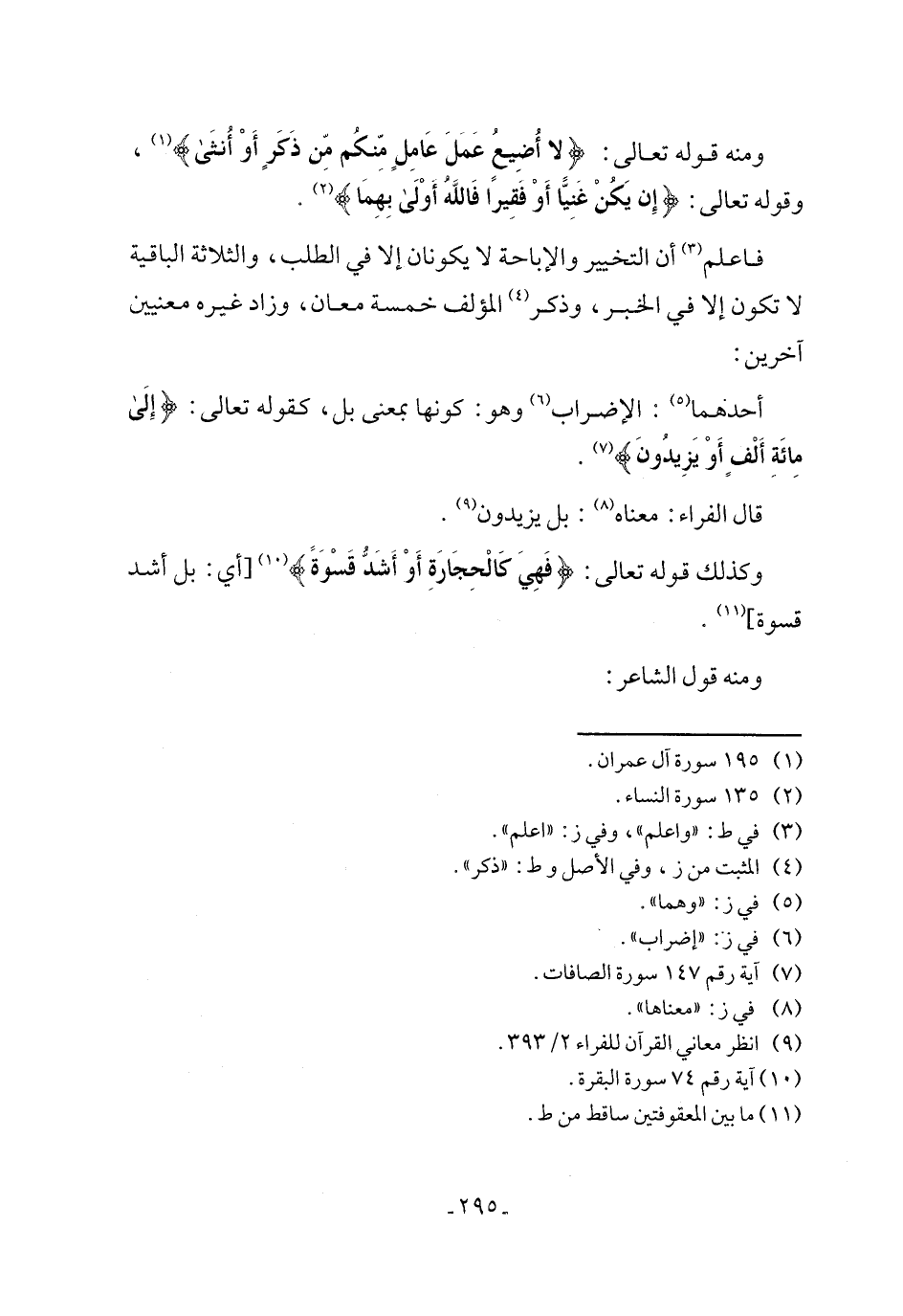 ومنه قوله تعالى: {لَا أُضِيعُ عَمَلَ عَامِلٍ مِنْكُمْ مِنْ ذَكَرٍ أَوْ أُنْثَى} (١)، وقوله تعالى: {إِنْ يَكُنْ غَنِيًّا أَوْ فَقِيرًا فَاللَّهُ أَوْلَى بِهِمَا} (٢).
