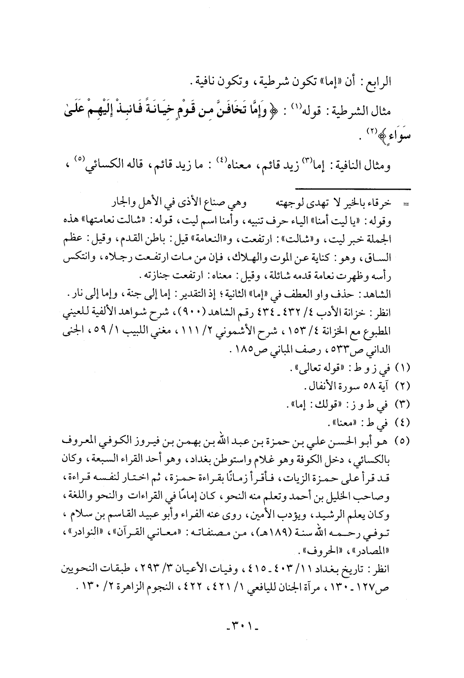 (٥) هو أبو الحسن علي بن حمزة بن عبد الله بن بهمن بن فيروز الكوفي المعروف بالكسائي، دخل الكوفة وهو غلام واستوطن بغداد، وهو أحد القراء السبعة، وكان قد قرأ على حمزة الزيات، فأقرأ زمانًا بقراءة حمزة، ثم اختار لنفسه قراءة، وصاحب الخليل بن أحمد وتعلم منه النحو، كان إمامًا في القراءات والنحو واللغة، وكان يعلم الرشيد، ويؤدب الأمين، روى عنه الفراء وأبو عبيد القاسم بن سلام، توفي رحمه الله سنة (١٨٩ هـ)، من مصنفاته: "معاني القرآن"، "النوادر"، "المصادر"، "الحروف".