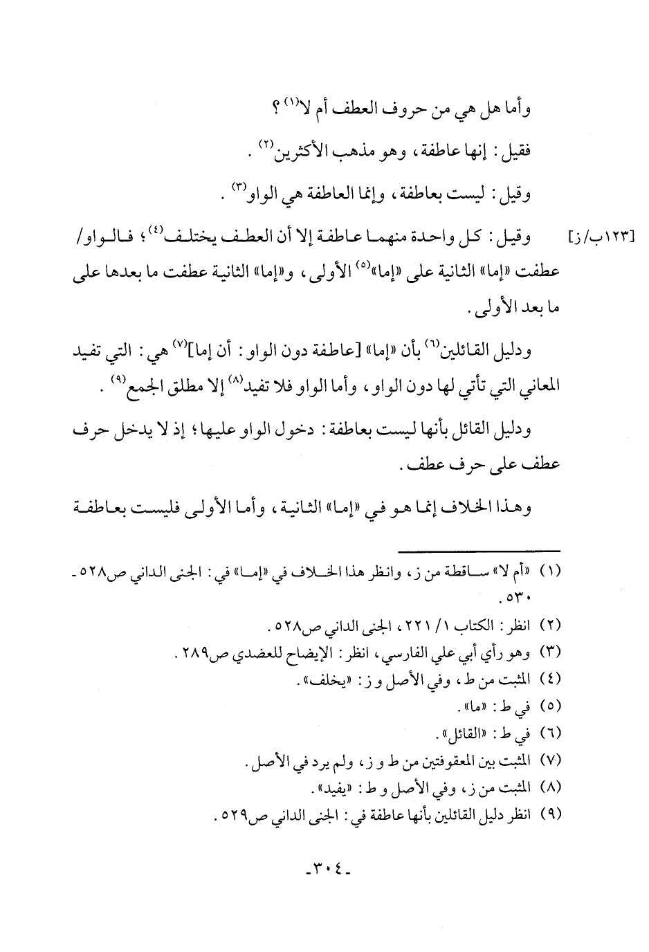 (٩) انظر دليل القائلين بأنها عاطفة في: الجنى الداني ص ٥٢٩.
