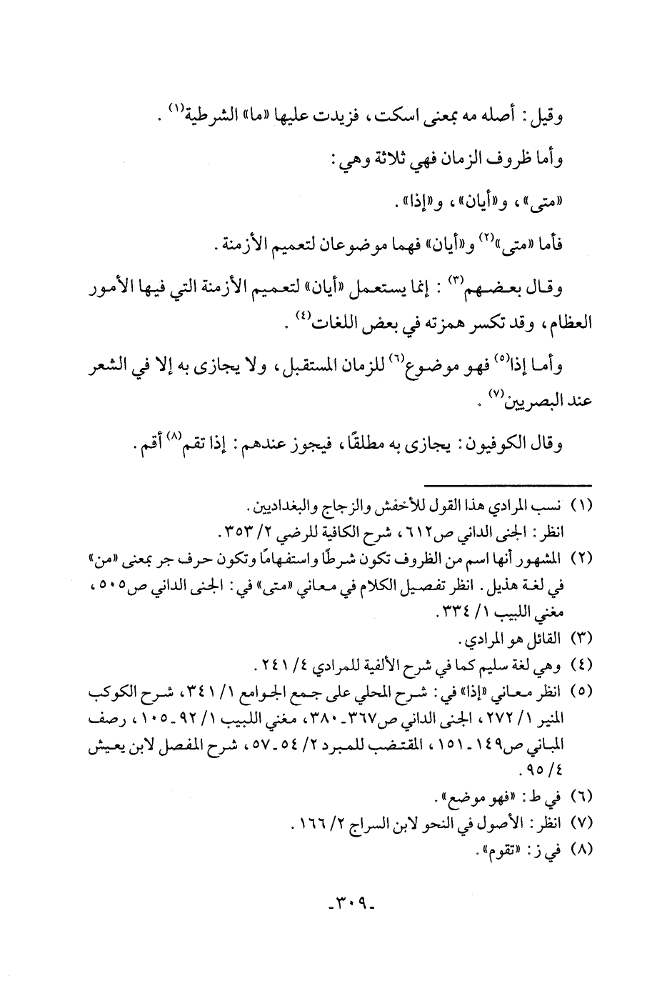 (٥) انظر معاني "إذا" في: شرح المحلي على جمع الجوامع ١/ ٣٤١، شرح الكوكب المنير ١/ ٢٧٢، الجنى الداني ص ٣٦٧ - ٣٨٠، مغني اللبيب ١/ ٩٢ - ١٠٥، رصف المباني ص ١٤٩ - ١٥١، المقتضب للمبرد ٢/ ٥٤ - ٥٧، شرح المفصل لابن يعيش ٤/ ٩٥.