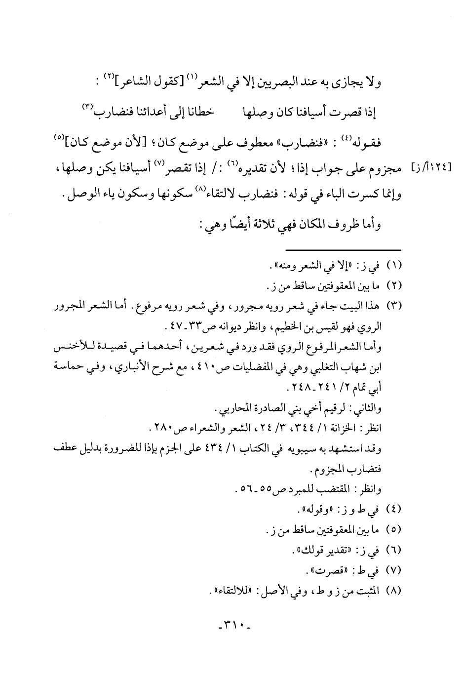 فقوله (٤): "فنضارب" معطوف على موضع كان؛ [لأن موضع كان] (٥) مجزوم على جواب إذا؛ لأن تقديره (٦): إذا تقصر (٧) أسيافنا يكن وصلها، وإنما كسرت الباء في قوله: فنضارب لالتقاء (٨) سكونها وسكون ياء الوصل.