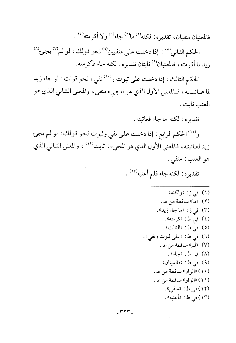 الحكم الثاني (٥): إذا دخلت على منفيين (٦) نحو قولك: لو لم (٧) يجئ (٨) زيد لما أكرمته، فالمعنيان (٩) ثابتان تقديره: لكنه جاء فأكرمته.