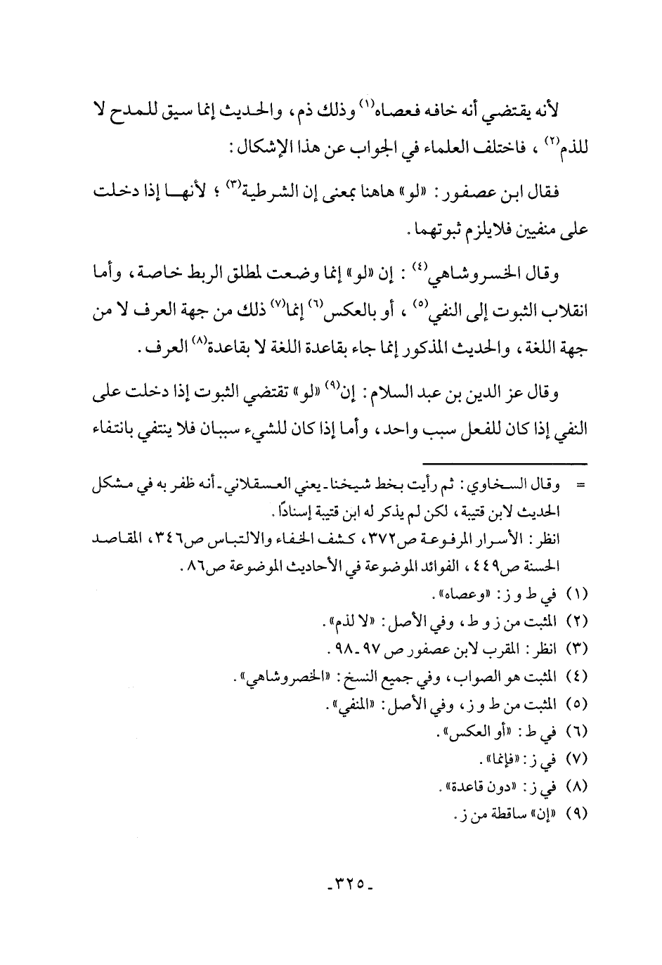 وقال الخسروشاهي (٤): إن "لو" إنما وضعت لمطلق الربط خاصة، وأما انقلاب الثبوت إلى النفي (٥)، أو بالعكس (٦) إنما (٧) ذلك من جهة العرف لا من جهة اللغة، والحديث المذكور إنما جاء بقاعدة اللغة لا بقاعدة (٨) العرف.