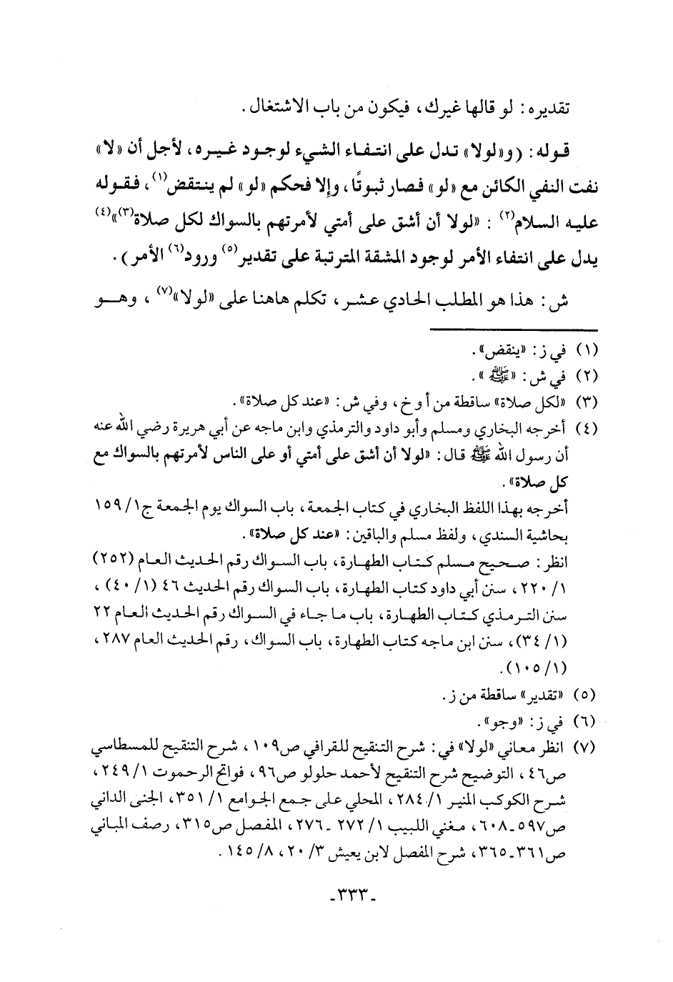 (٧) انظر معاني "لولا" في: شرح التنقيح للقرافي ص ١٠٩، شرح التنقيح للمسطاسي ص ٤٦، التوضيح شرح التنقيح لأحمد حلولو ص ٩٦، فواتح الرحموت ١/ ٢٤٩، شرح الكوكب المنير ١/ ٢٨٤، المحلي على جمع الجوامع ١/ ٣٥١، الجنى الداني ص ٥٩٧ - ٦٠٨، مغني اللبيب ١/ ٢٧٢ - ٢٧٦، المفصل ص ٣١٥، رصف المباني ص ٣٦١ - ٣٦٥، شرح المفصل لابن يعيش ٣/ ٢٠، ٨/ ١٤٥.