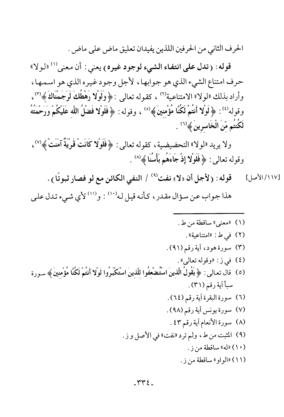قوله: (تدل على انتفاء الشيء لوجود غيره) يعني: أن معنى (١) "لولا" حرف امتناع الشيء الذي هو جوابها، لأجل وجود غيره الذي هو اسمها، وأراد بذلك "لولا" الامتناعية (٢)، كقوله تعالى: {ولَوْلا رَهْطُكَ لَرَجَمْنَاكَ} (٣)، وقوله (٤): {لَوْلا أَنتُمْ لَكُنَّا مُؤْمِنِينَ} (٥)، وقوله: {فَلَوْلا فَضْلُ الله عَلَيْكُمْ وَرَحْمَتُهُ لَكُنتُم مِّنَ الْخَاسِرِينَ} (٦).