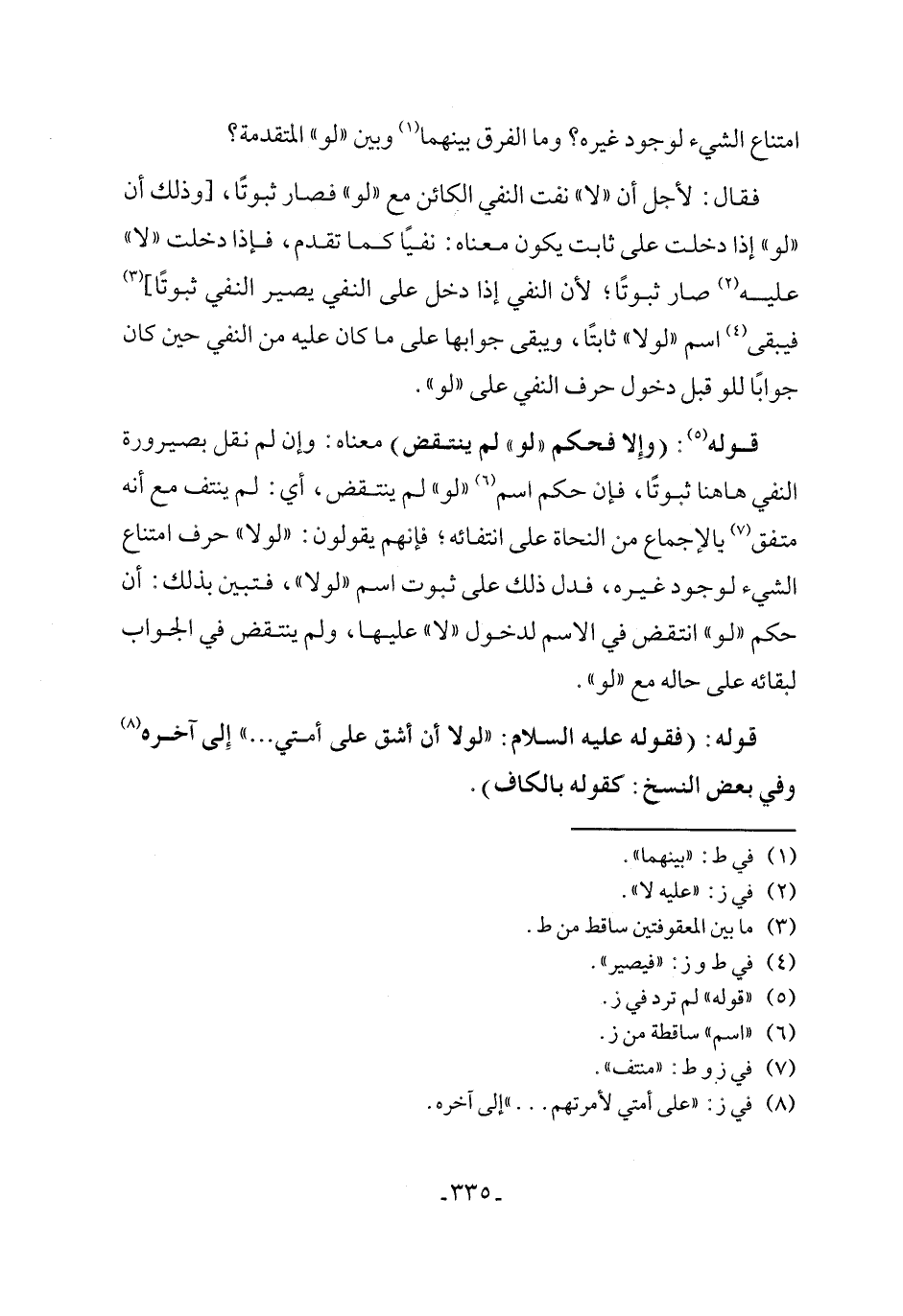 قوله (٥): (وإِلا فحكم "لو" لم ينتقض) معناه: وإن لم نقل بصيرورة النفي ها هنا ثبوتًا، فإن حكم اسم (٦) "لو" لم ينتقض، أي: لم ينتف مع أنه متفق (٧) يالإجماع من النحاة على انتفائه؛ فإنهم يقولون: "لولا" حرف امتناع الشيء لوجود غيره، فدل ذلك على ثبوت اسم "لولا"، فتبين بذلك: أن حكم "لو" انتقض في الاسم لدخول "لا" عليها، ولم ينتقض في الجواب لبقائه على حاله مع "لو".