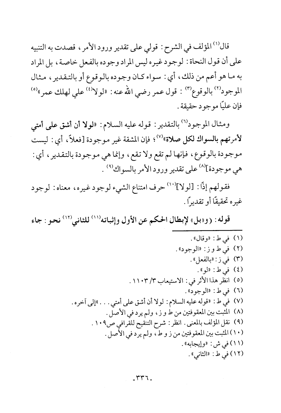 ومثال الموجود (٦) بالتقدير: قوله عليه السلام: "لولا أن أشق على أمتي لأمرتهم بالسواك لكل صلاة" (٧)؛ فإن المشقة غير موجودة [فعلاً، أي: ليست موجودة بالوقوع، فإنها لم تقع ولا تقع، وإنما هي موجودة بالتقدير، أي: هي موجودة] (٨) على تقدير ورود الأمر بالسواك (٩).