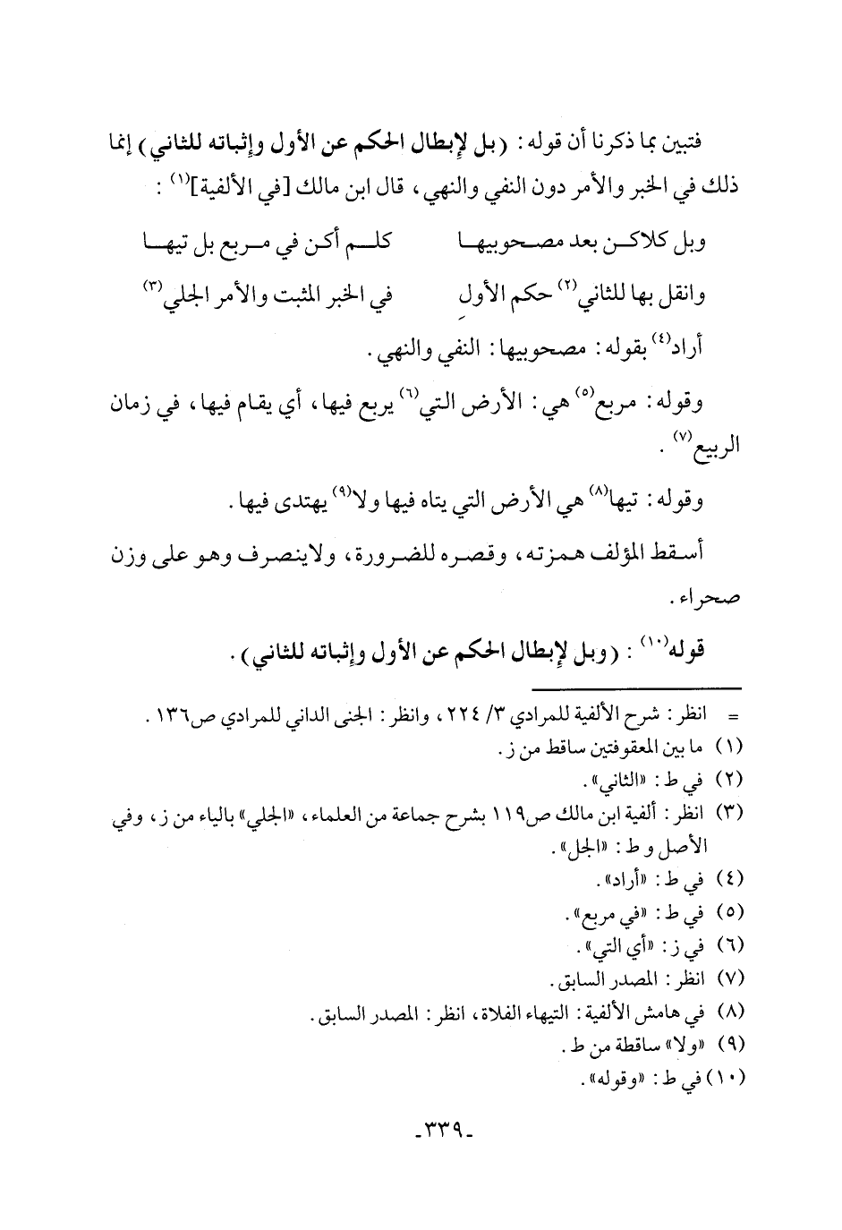فتبين بما ذكرنا أن قوله: (بل لإِبطال الحكم عن الأول وإِثباته للثاني) إنما ذلك في الخبر والأمر دون النفي والنهي، قال ابن مالك [في الألفية] (١):