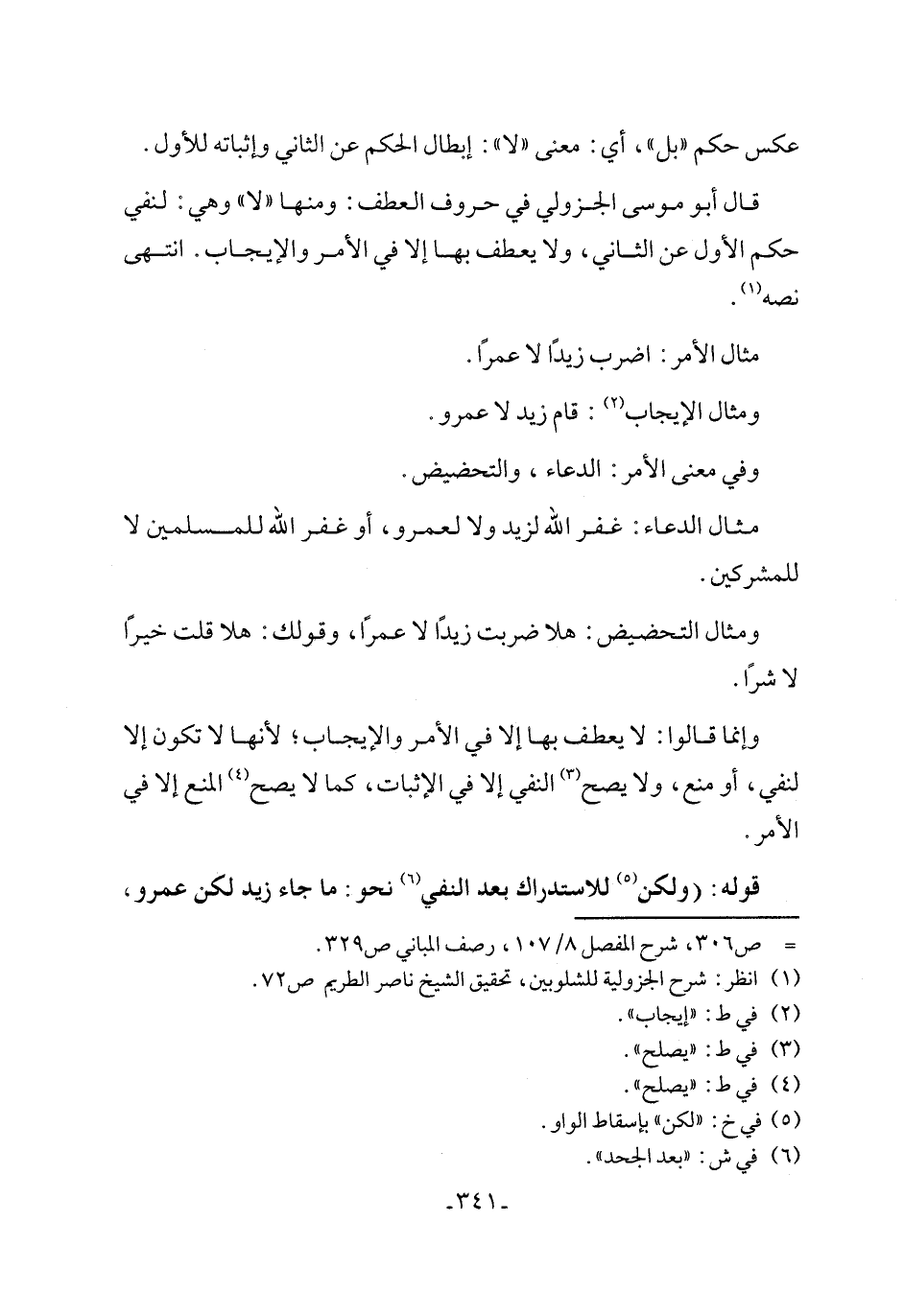 قال أبو موسى الجزولي في حروف العطف: ومنها "لا" وهي: لنفي حكم الأول عن الثاني، ولا يعطف بها إلا في الأمر والإيجاب. انتهى نصه (١).