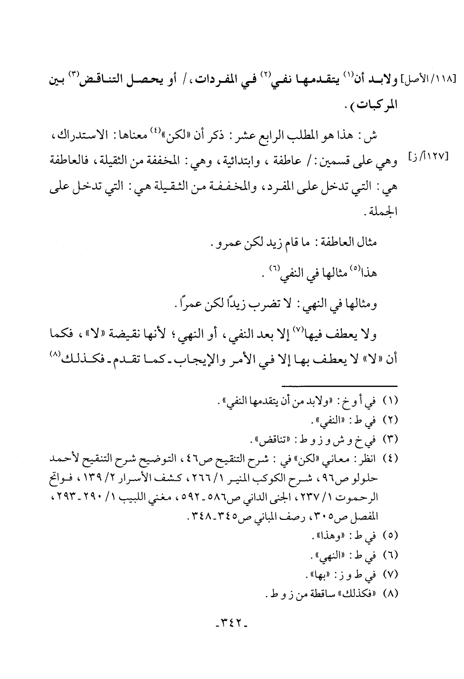 ش: هذا هو المطلب الرابع عشر: ذكر أن "لكن" (٤) معناها: الاستدراك، وهي على قسمين: عاطفة، وابتدائية، وهي: المخففة من الثقيلة، فالعاطفة هي: التي تدخل على المفرد، والمخففة من الثقيلة هي: التي تدخل على الجملة.
