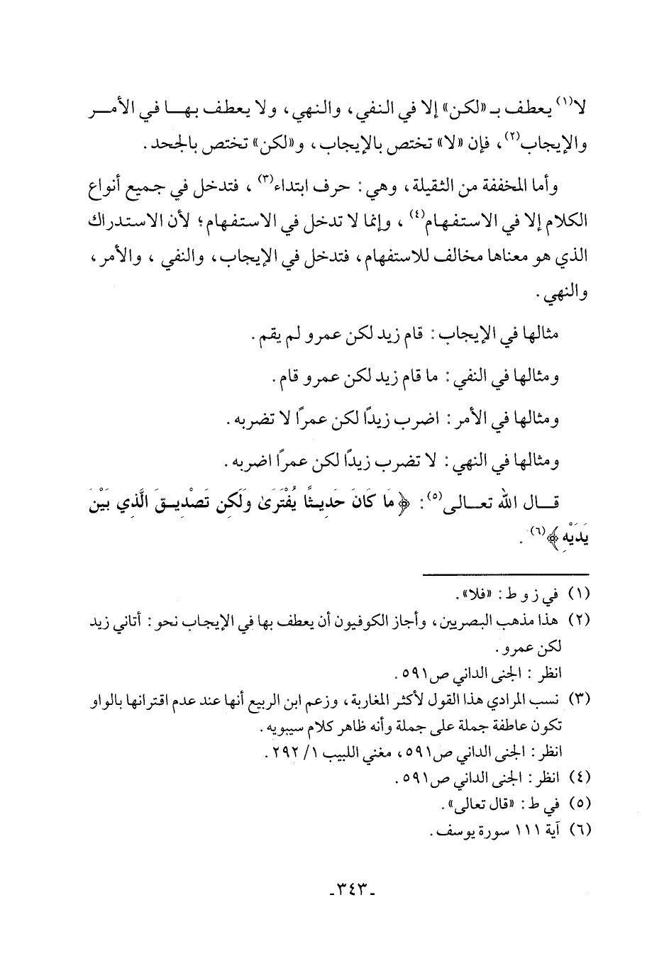 لا (١) يعطف بـ "لكن" إلا في النفي، والنهي، ولا يعطف بها في الأمر والإيجاب (٢)، فإن "لا" تختص بالإيجاب، و"لكن" تختص بالجحد.