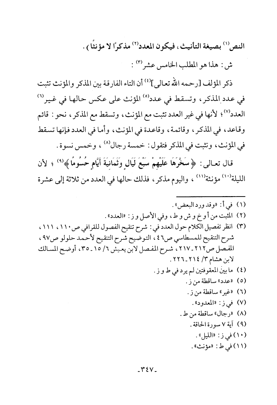 النص (١) بصيغة التأنيث، فيكون المعدد (٢) مذكرًا لا مؤنثًا).