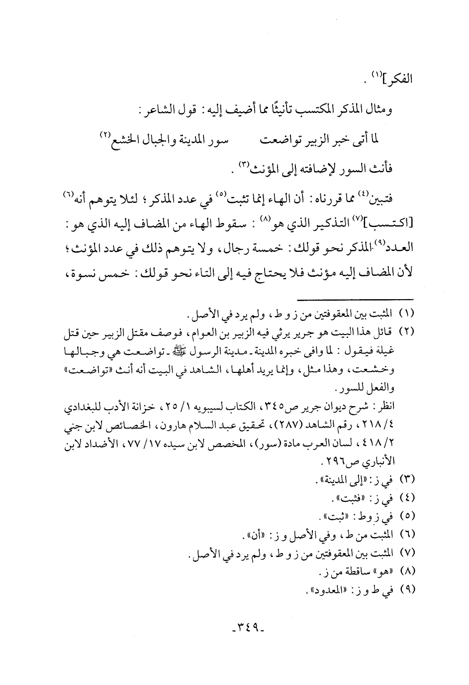 (٢) قائل هذا البيت هو جرير يرثي فيه الزبير بن العوام، فوصف مقتل الزبير حين قتل غيلة فيقول: لما وافى خبره المدينة - مدينة الرسول - صلى الله عليه وسلم - تواضعت هي وجبالها وخشعت، وهذا مثل، وإنما يريد أهلها، الشاهد في البيت أنه أنث "تواضعت" والفعل للسور.