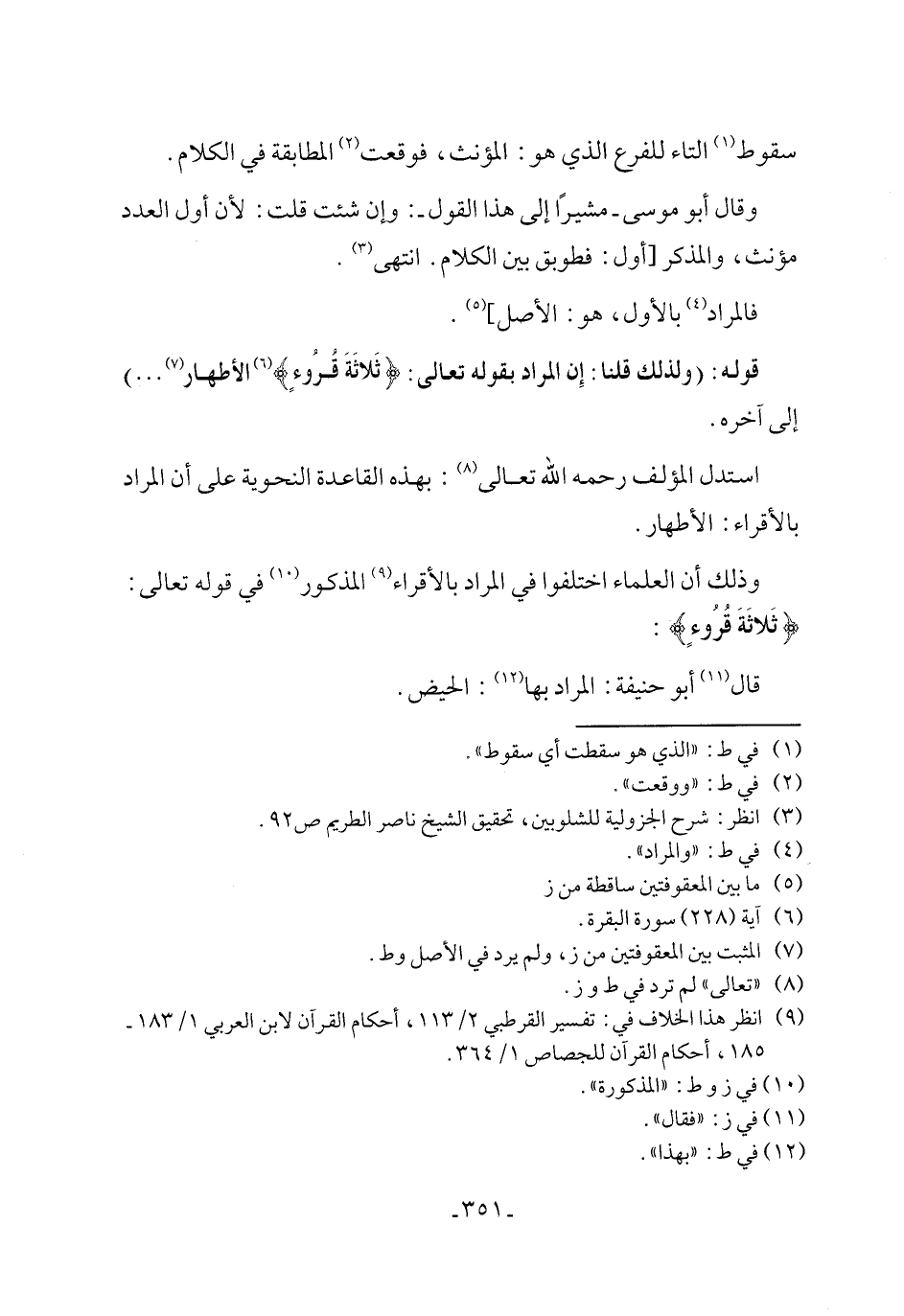 قوله: (ولذلك قلنا: إِن المراد بقوله تعالى: {ثَلاثَةَ قُروءٍ} (٦) الأطهار (٧) ...) إلى آخره.