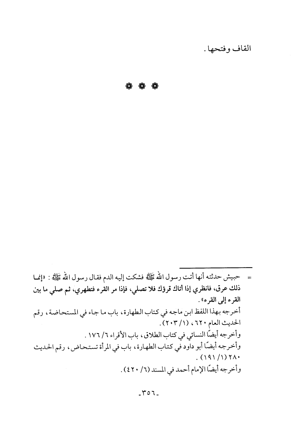 أخرجه بهذا اللفظ ابن ماجه في كتاب الطهارة، باب ما جاء في المستحاضة، رقم الحديث العام ٦٢٠، (١/ ٢٠٣).