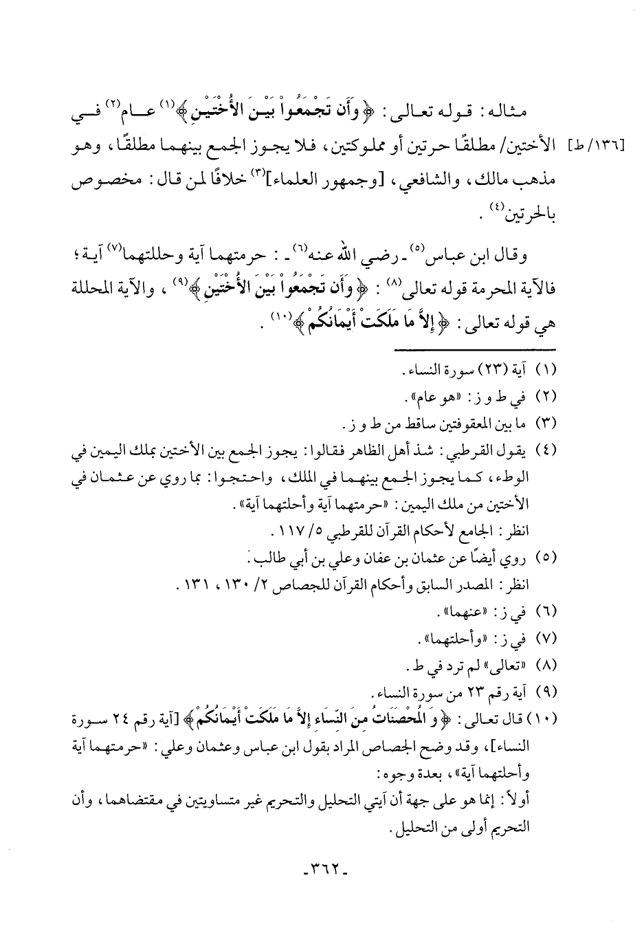 (١٠) قال تعالى: {وَالْمُحْصَنَاتُ مِنَ النِّسَاءِ إِلَّا مَا مَلَكَتْ أَيْمَانُكُمْ} [آية رقم ٢٤ سورة النساء] , وقد وضح الجصاص المراد بقول ابن عباس وعثمان وعلي: "حرمتهما آية وأحلتهما آية"، بعدة وجوه: