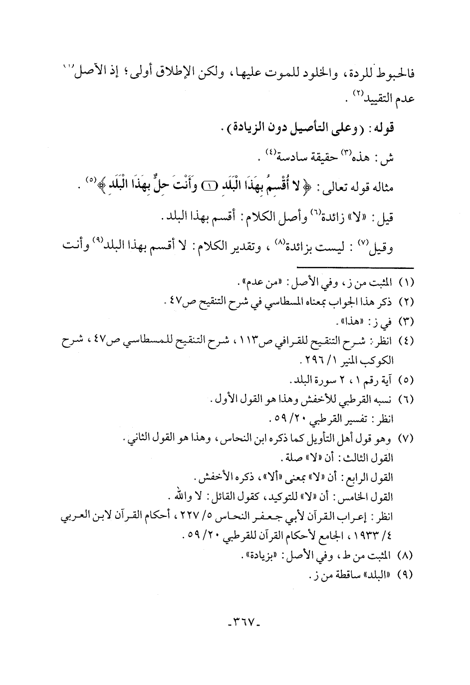 وقيل (٧): ليست بزائدة (٨)، وتقدير الكلام: لا أقسم بهذا البلد (٩) وأنت