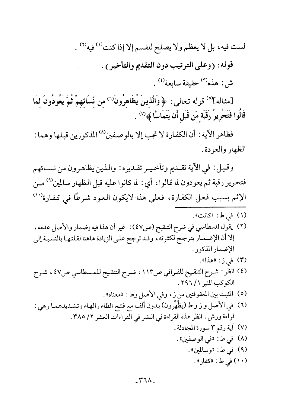 (٢) يقول المسطاسي في شرح التنقيح (ص ٤٧): غير أن هذا فيه إضمار والأصل عدمه، إلا أن الإضمار يترجح لكثرته، وقد ترجح على الزيادة ها هنا لقلتها بالنسبة إلى الإضمار المذكور.