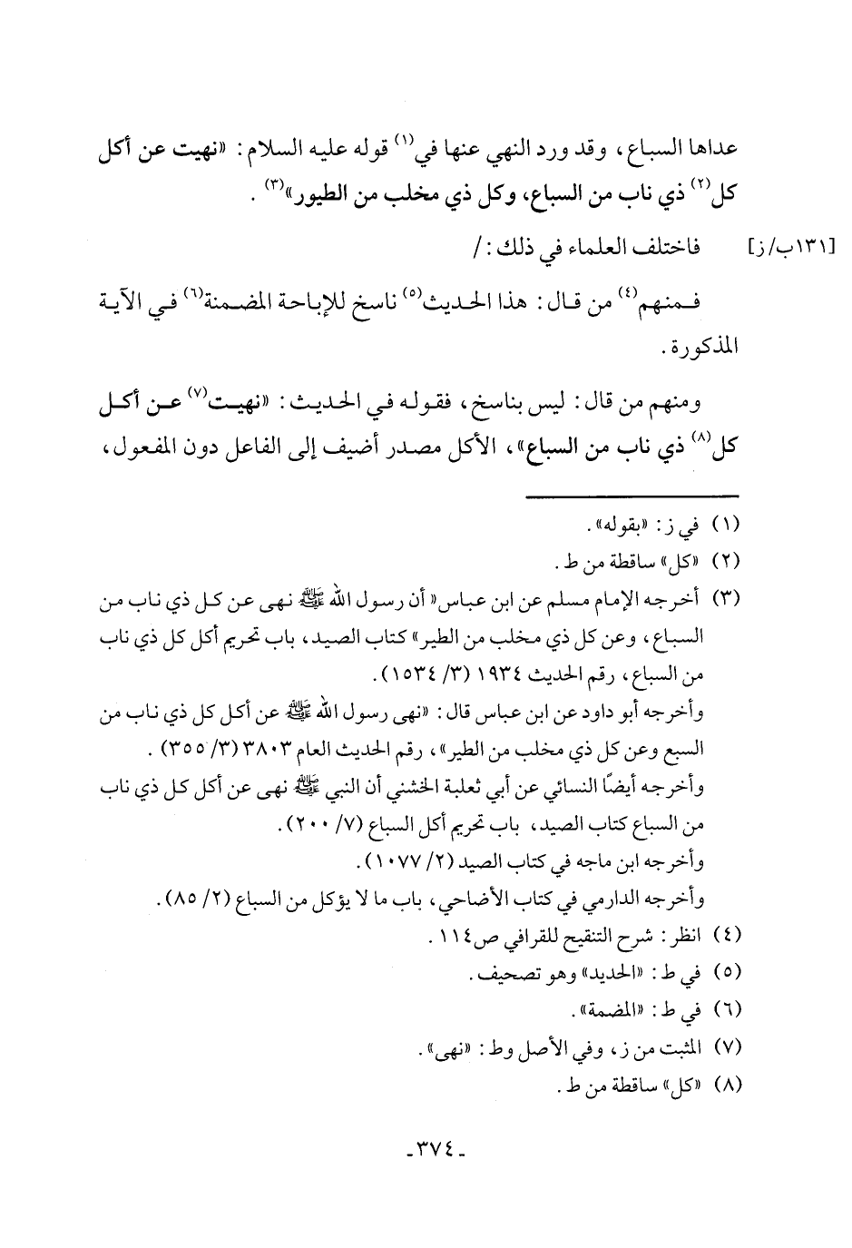 ومنهم من قال: ليس بناسخ، فقوله في الحديث: "نهيت (٧) عن أكل كل (٨) ذي ناب من السباع"، الأكل مصدر أضيف إلى الفاعل دون المفعول،