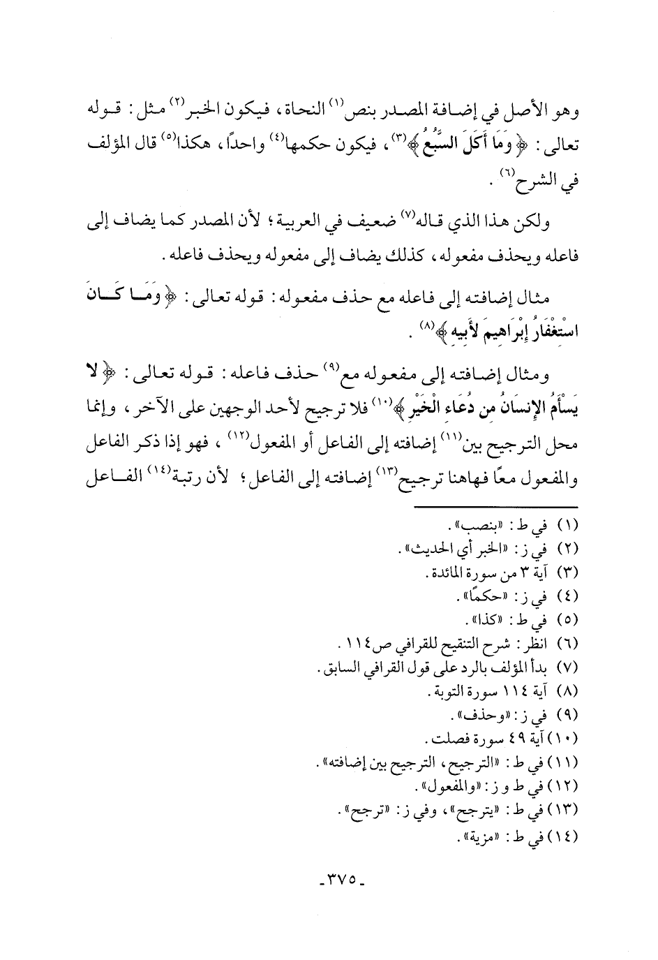 ومثال إضافته إلى مفعوله مع (٩) حذف فاعله: قوله تعالى: {لا يَسْأَمُ الإِنسَانُ مِن دُعَاءِ الْخَيْرِ} (١٠) فلا ترجيح لأحد الوجهين على الآخر، وإنما محل الترجيح بين (١١) إضافته إلى الفاعل أو المفعول (١٢)، فهو إذا ذكر الفاعل والمفعول معًا فها هنا ترجيح (١٣) إضافته إلى الفاعل؛ لأن رتبة (١٤) الفاعل