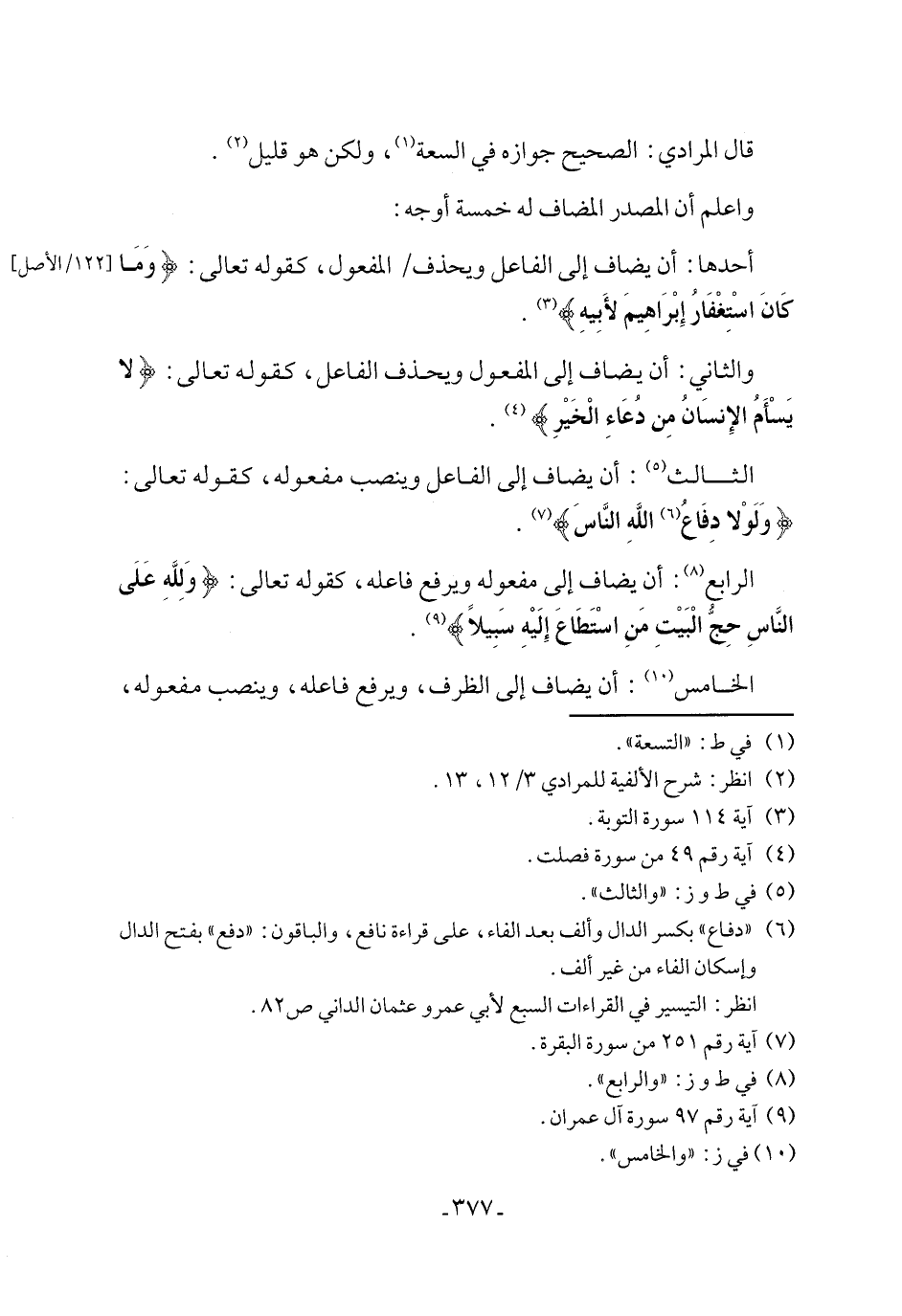 الثالث (٥): أن يضاف إلى الفاعل وينصب مفعوله، كقوله تعالى: {وَلَوْلَا دَفْعُ (٦) اللَّهِ النَّاسَ} (٧).