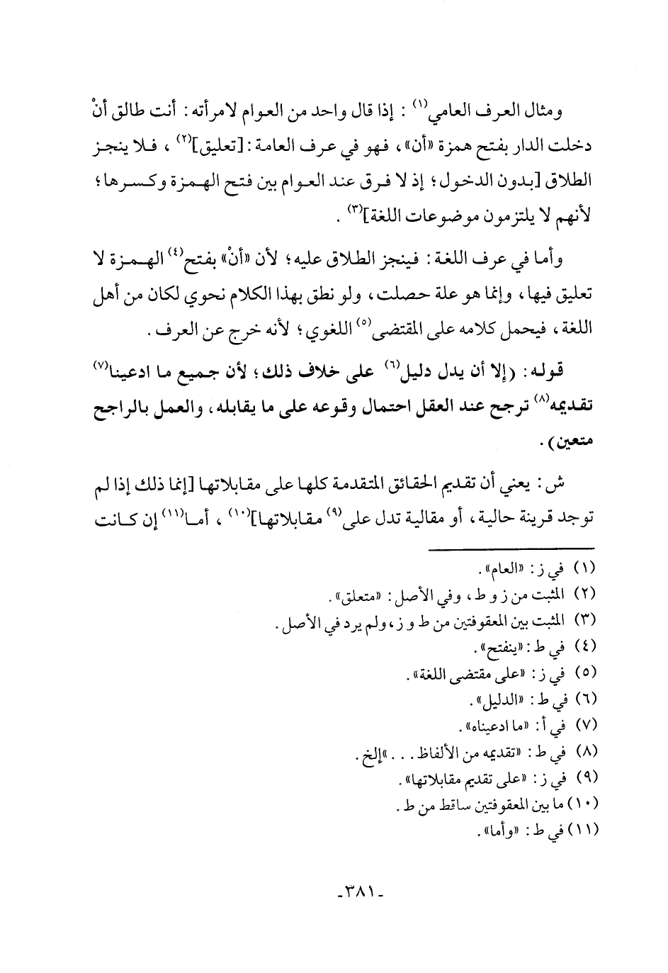 ش: يعني أن تقديم الحقائق المتقدمة كلها على مقابلاتها [إنما ذلك إذا لم توجد قرينة حالية، أو مقالية تدل على (٩) مقابلاتها] (١٠)، أما (١١) إن كانت