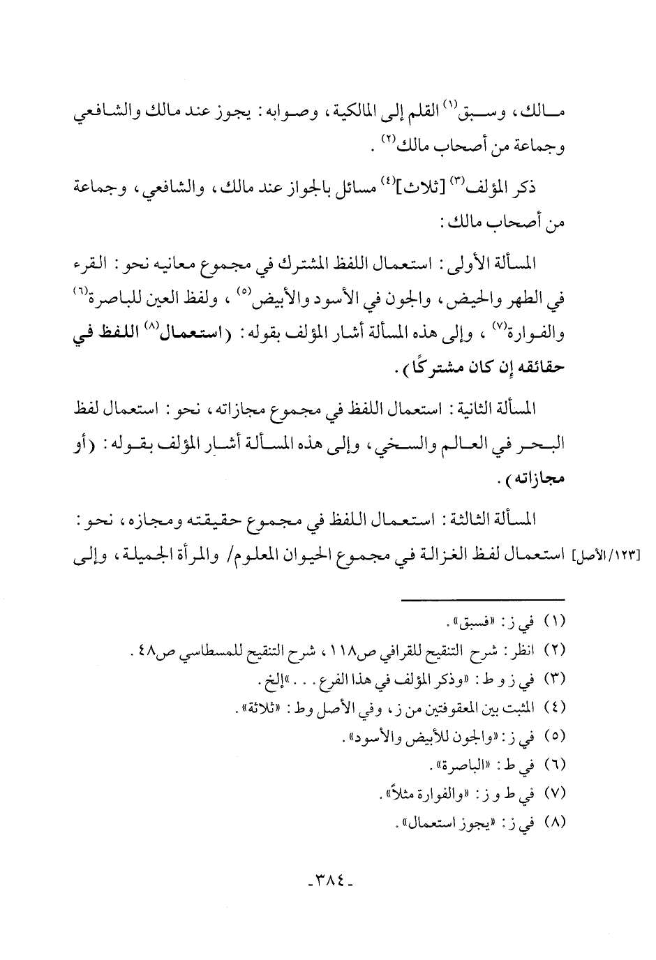 المسألة الأولى: استعمال اللفظ المشترك في مجموع معانيه نحو: القرء في الطهر والحيض، والجون في الأسود والأبيض (٥)، ولفظ العين للباصرة (٦) والفوارة (٧)، وإلى هذه المسألة أشار المؤلف بقوله: (استعمال (٨) اللفظ في حقائقه إِن كان مشتركًا).