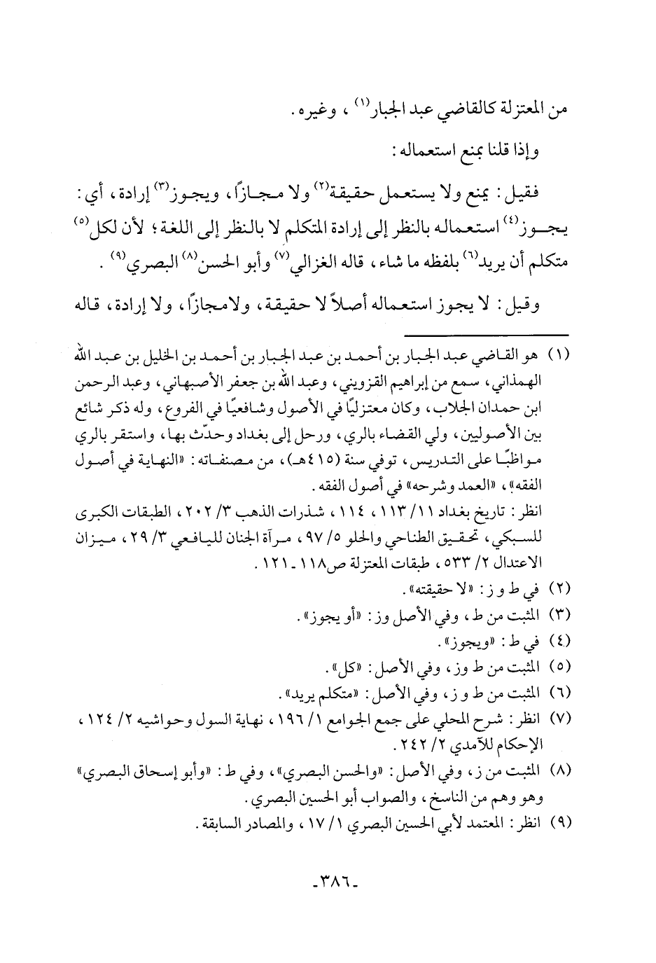 فقيل: يمنع ولا يستعمل حقيقة (٢) ولا مجازًا، ويجوز (٣) إرادة، أي: يجوز (٤) استعماله بالنظر إلى إرادة المتكلم لا بالنظر إلى اللغة؛ لأن لكل (٥) متكلم أن يريد (٦) بلفظه ما شاء، قاله الغزالي (٧) وأبو الحسن (٨) البصري (٩).