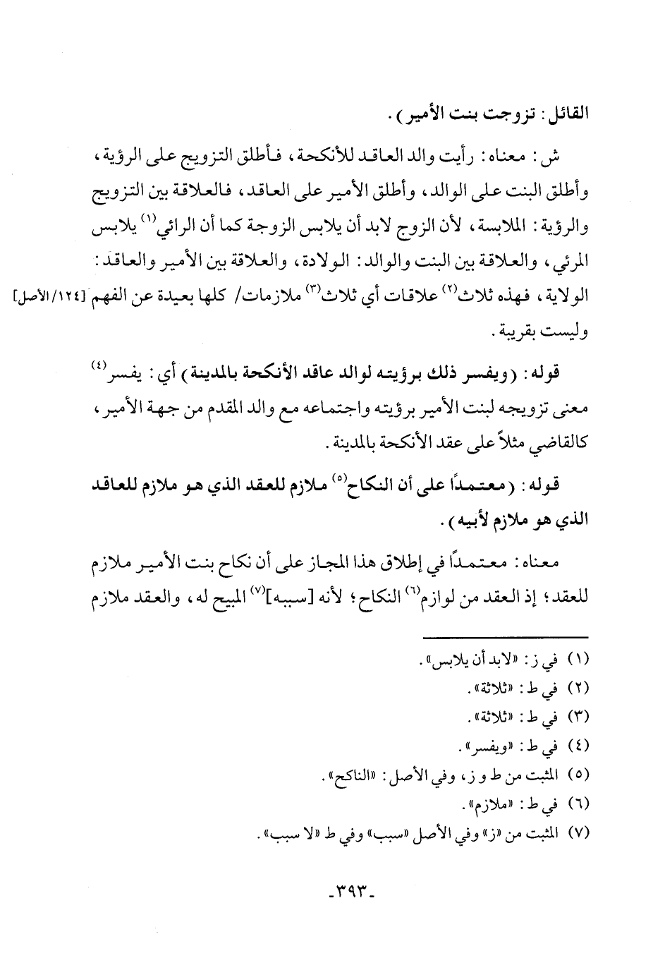 ش: معناه: رأيت والد العاقد للأنكحة، فأطلق التزويج على الرؤية، وأطلق البنت على الوالد، وأطلق الأمير على العاقد، فالعلاقة بين التزويج والرؤية: الملابسة، لأن الزوج لا بد أن يلابس الزوجة كما أن الرائي (١) يلابس المرئي، والعلاقة بين البنت والوالد: الولادة، والعلاقة بين الأمير والعاقد: الولاية، فهذه ثلاث (٢) علاقات أي ثلاث (٣) ملازمات كلها بعيدة عن الفهم وليست بقريبة.