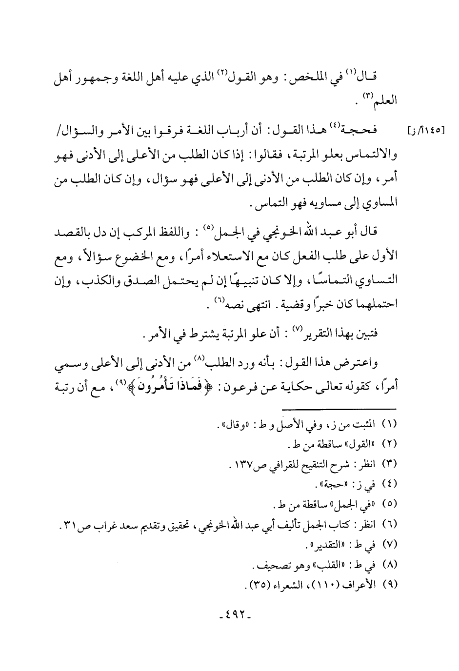 واعترض هذا القول: بأنه ورد الطلب (٨) من الأدنى إلى الأعلى وسمي أمرًا، كقوله تعالى حكاية عن فرعون: {فَمَاذَا تَأْمُرُونَ} (٩)، مع أن رتبة