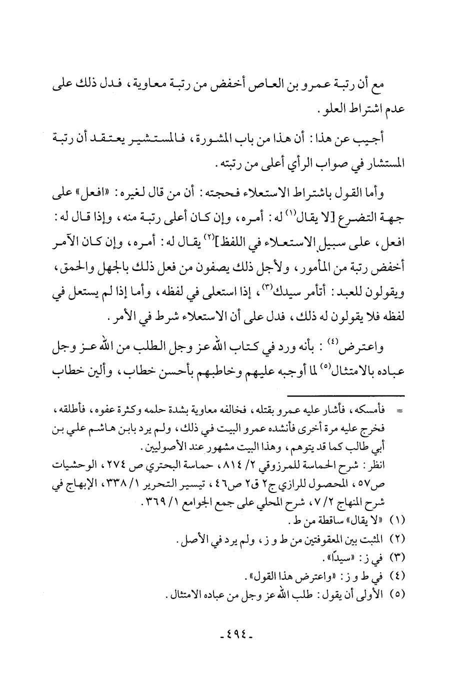مع أن رتبة عمرو بن العاص أخفض من رتبة معاوية، فدل ذلك على عدم اشتراط العلو.