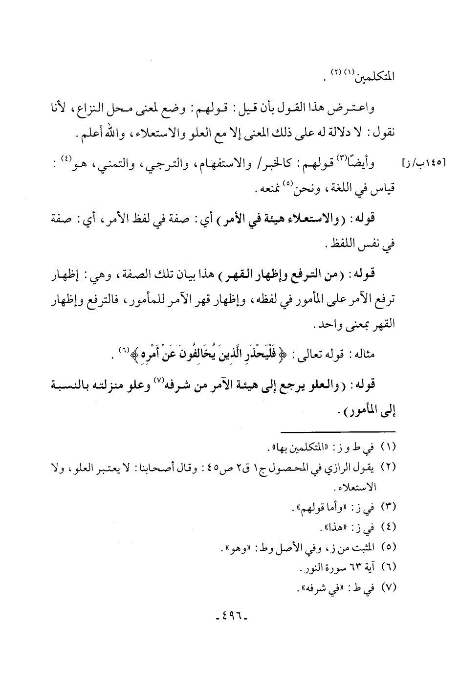 (٢) يقول الرازي في المحصول ج ١ ق ٢ ص ٤٥: وقال أصحابنا: لا يعتبر العلو، ولا الاستعلاء.