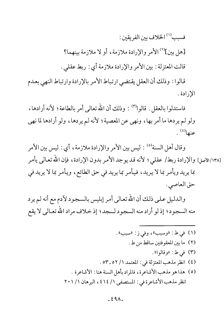 وقال أهل السنة (٥): ليس بين الأمر والإرادة ملازمة، أي: ليس بين الأمر والإرادة ربط عقلي؛ لأنه قد يوجد الأمر بدون الإرادة، فإن الله تعالى يأمر بما يريد ويأمر بما لا يريد، فيأمر بما يريد في حق الطائع، ويأمر بما لا يريد في حق العاصي.