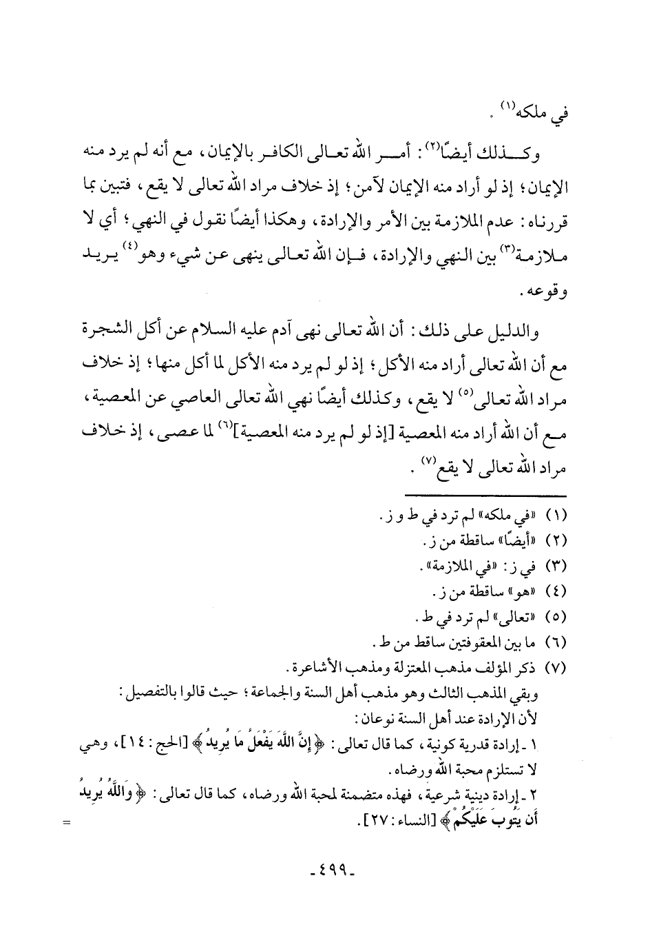وكذلك أيضًا (٢): أمر الله تعالى الكافر بالإيمان، مع أنه لم يرد منه الإيمان؛ إذ لو أراد منه الإيمان لآمن؛ إذ خلاف مراد الله تعالى لا يقع، فتبين بما قررناه: عدم الملازمة بين الأمر والإرادة، وهكذا أيضًا نقول في النهي؛ أي لا ملازمة (٣) بين النهي والإرادة، فإن الله تعالى ينهى عن شيء وهو (٤) يريد وقوعه.
