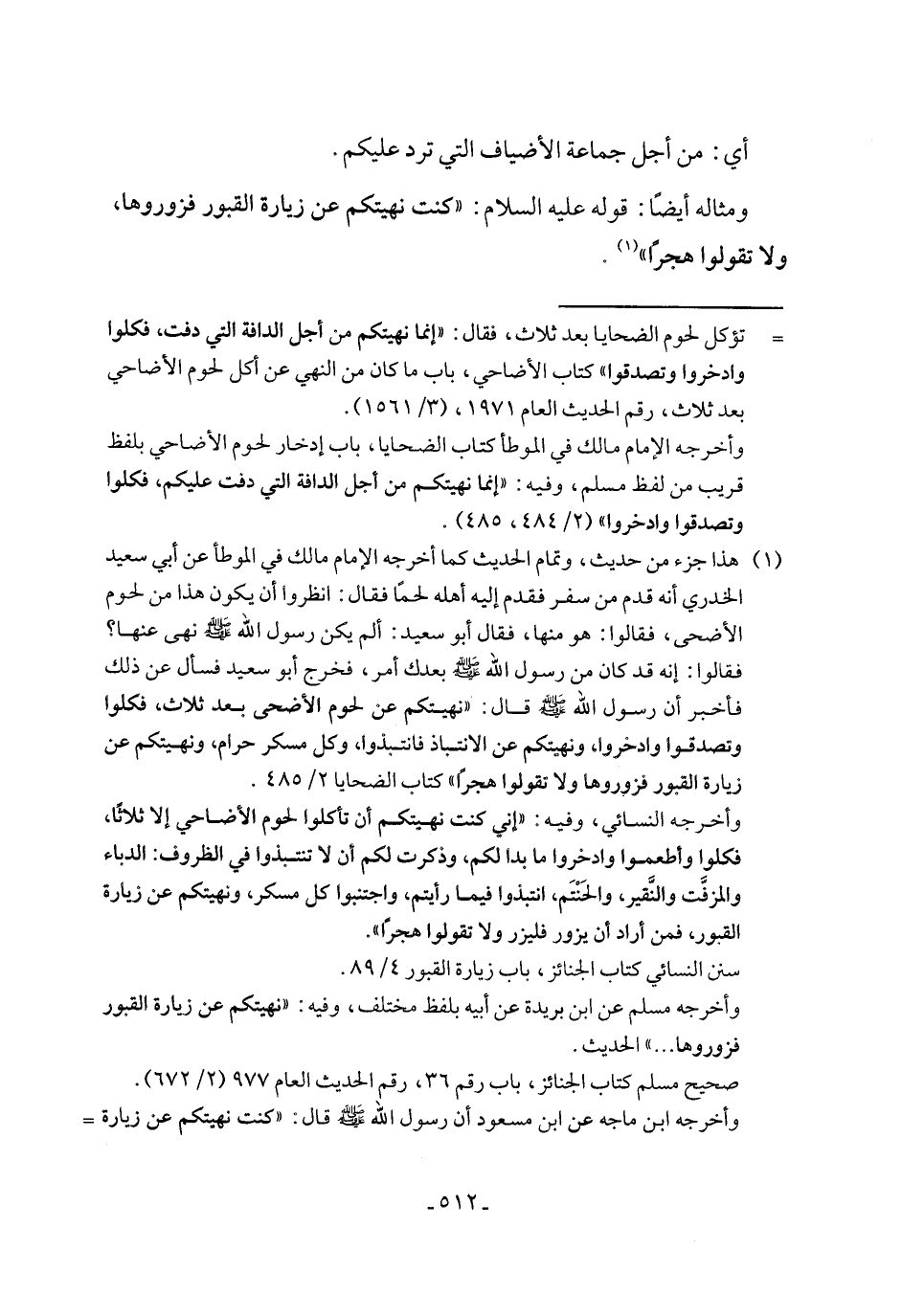 (١) هذا جزء من حديث، وتمام الحديث كما أخرجه الإمام مالك في الموطأ عن أبي سعيد الخدري أنه قدم من سفر فقدم إليه أهله لحمًا فقال: انظروا أن يكون هذا من لحوم الأضحى، فقالوا: هو منها، فقال أبو سعيد: ألم يكن رسول الله - صلى الله عليه وسلم - نهى عنها؟ فقالوا: إنه قد كان من رسول الله - صلى الله عليه وسلم - بعدك أمر، فخرج أبو سعيد فسأل عن ذلك فأخبر أن رسول الله - صلى الله عليه وسلم - قال: "نهيتكم عن لحوم الأضحى بعد ثلاث، فكلوا وتصدقوا وادخروا, ونهيتكم عن الانتباذ فانتبذوا، وكل مسكر حرام، ونهيتكم عن زيارة القبور فزوروها ولا تقولوا هجرًا" كتاب الضحايا ٢/ ٤٨٥.