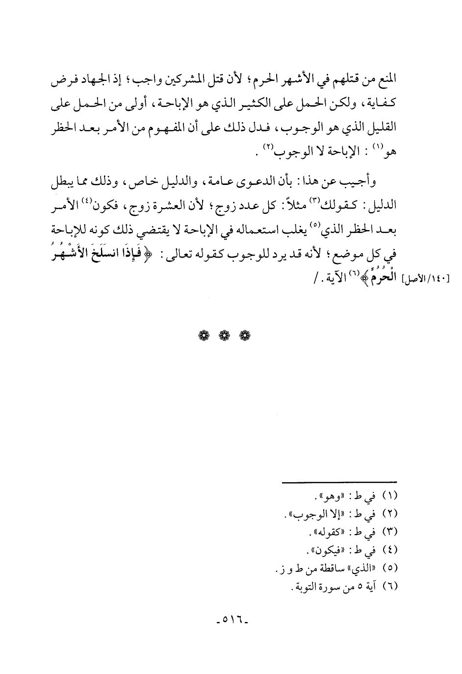المنع من قتلهم في الأشهر الحرم؛ لأن قتل المشركين واجب؛ إذ الجهاد فرض كفاية، ولكن الحمل على الكثير الذي هو الإباحة، أولى من الحمل على القليل الذي هو الوجوب، فدل ذلك على أن المفهوم من الأمر بعد الحظر هو (١): الإباحة لا الوجوب (٢).
