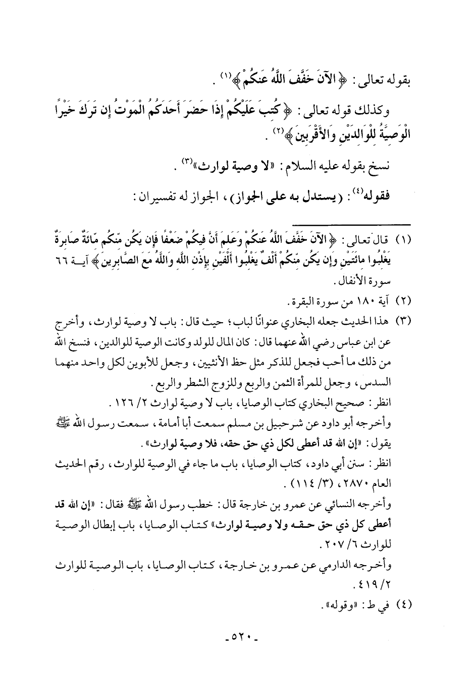 (٣) هذا الحديث جعله البخاري عنوانًا لباب؛ حيث قال: باب لا وصية لوارث، وأخرج عن ابن عباس رضي الله عنهما قال: كان المال للولد وكانت الوصية للوالدين، فنسخ الله من ذلك ما أحب فجعل للذكر مثل حظ الأنثيين، وجعل للأبوين لكل واحد منهما السدس، وجعل للمرأة الثمن والربع وللزوج الشطر والربع.
