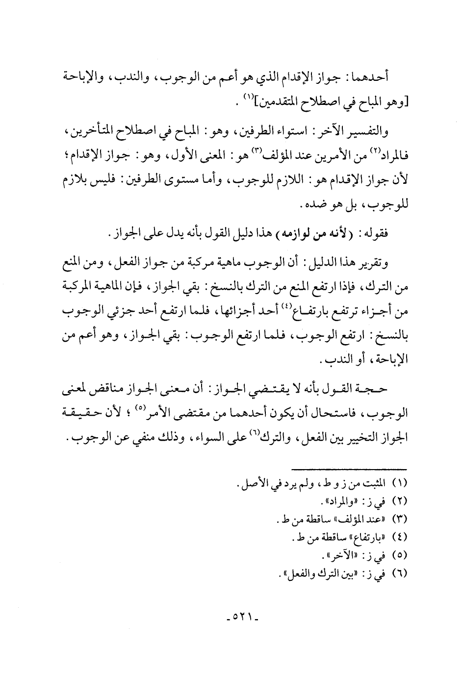والتفسير الآخر: استواء الطرفين، وهو: المباح في اصطلاح المتأخرين، فالمراد (٢) من الأمرين عند المؤلف (٣) هو: المعنى الأول، وهو: جواز الإقدام؛ لأن جواز الإقدام هو: اللازم للوجوب، وأما مستوى الطرفين: فليس بلازم للوجوب، بل هو ضده.
