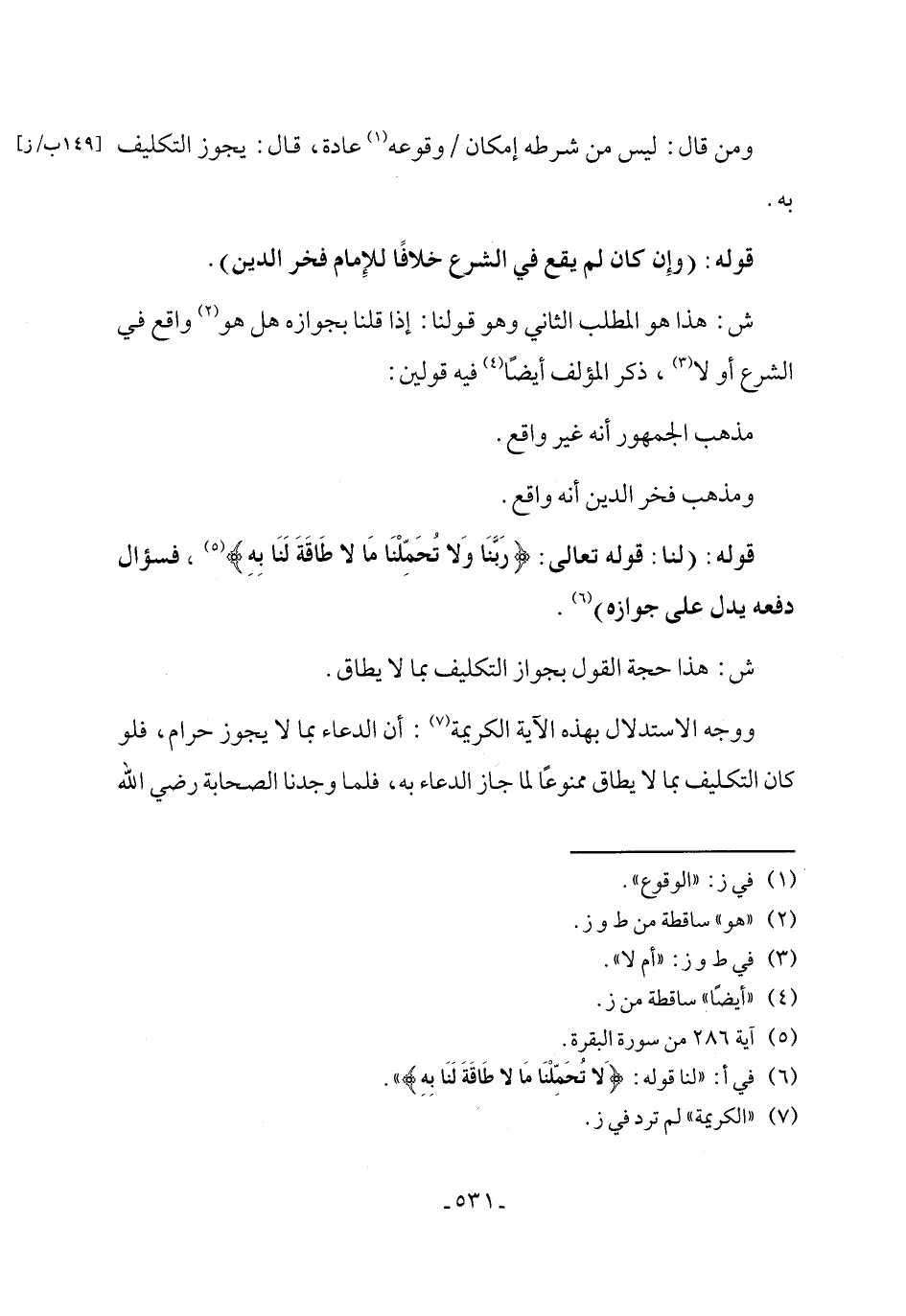 ووجه الاستدلال بهذه الآية الكريمة (٧): أن الدعاء بما لا يجوز حرام، فلو كان التكليف بما لا يطاق ممنوعًا لما جاز الدعاء به، فلما وجدنا الصحابة رضي الله