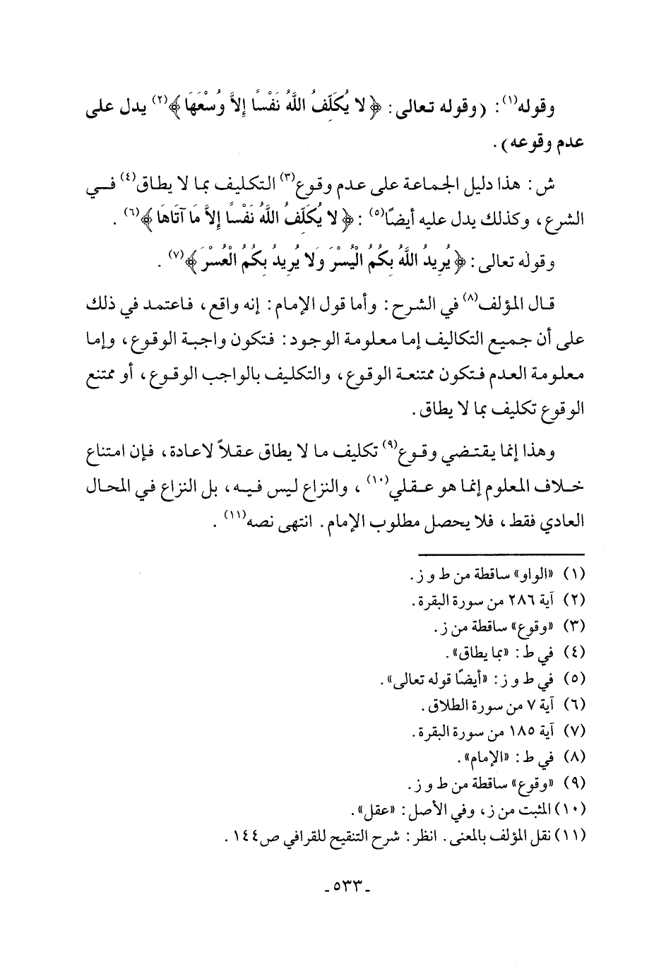 ش: هذا دليل الجماعة على عدم وقوع (٣) التكليف بما لا يطاق (٤) في الشرع، وكذلك يدل عليه أيضًا (٥): {لا يُكَلِّفُ اللَّهُ نَفْسًا إلا مَا آتَاهَا} (٦).
