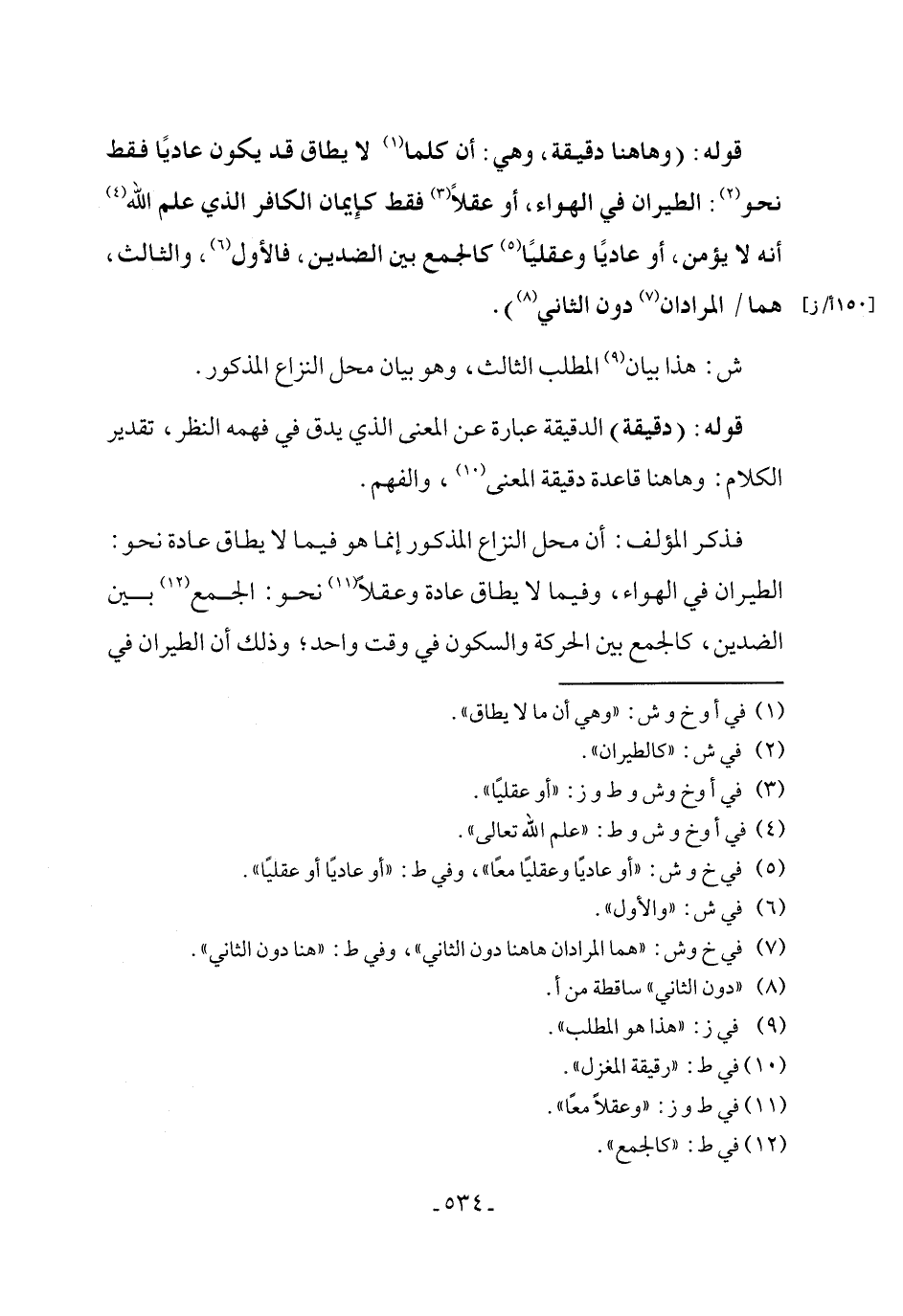 قوله: (وها هنا دقيقة، وهي: أن كلما (١) لا يطاق قد يكون عاديًا فقط نحو (٢): الطيران في الهواء، أو عقلاً (٣) فقط كإِيمان الكافر الذي علم الله (٤) أنه لا يؤمن، أو عاديًا وعقليًا (٥) كالجمع بين الضدين، فالأول (٦)، والثالث، هما المرادان (٧) دون الثاني (٨)).